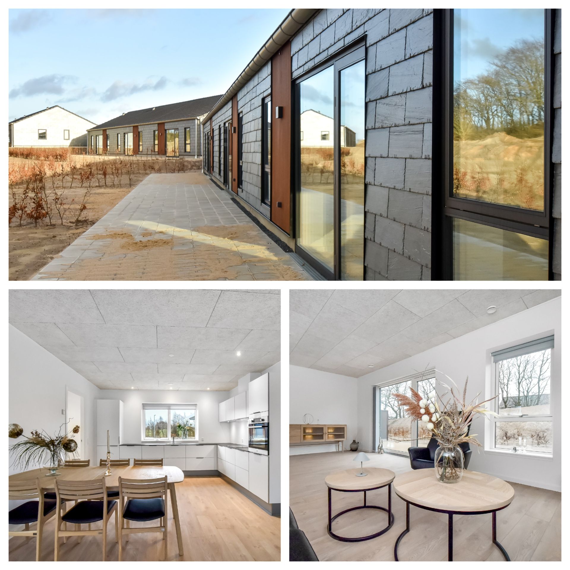 - Udbuddet er rigtig stort, og derfor er det også vigtigt, at man skiller sig lidt ud fra de andre projekter på den positive måde. Og det gør det projekt her. Facaden på boligerne er lavet i et unikt design med bæredygtigt træværk og skiffer. Boligerne er indrettet med akustiklofter, og der er en rigtig funktionel udnyttelse af de 92 – 95 kvadratmeter, som boligerne rummer. Mange roser det unikke facade-design, som bare passer så godt ind i naturområdet herude.