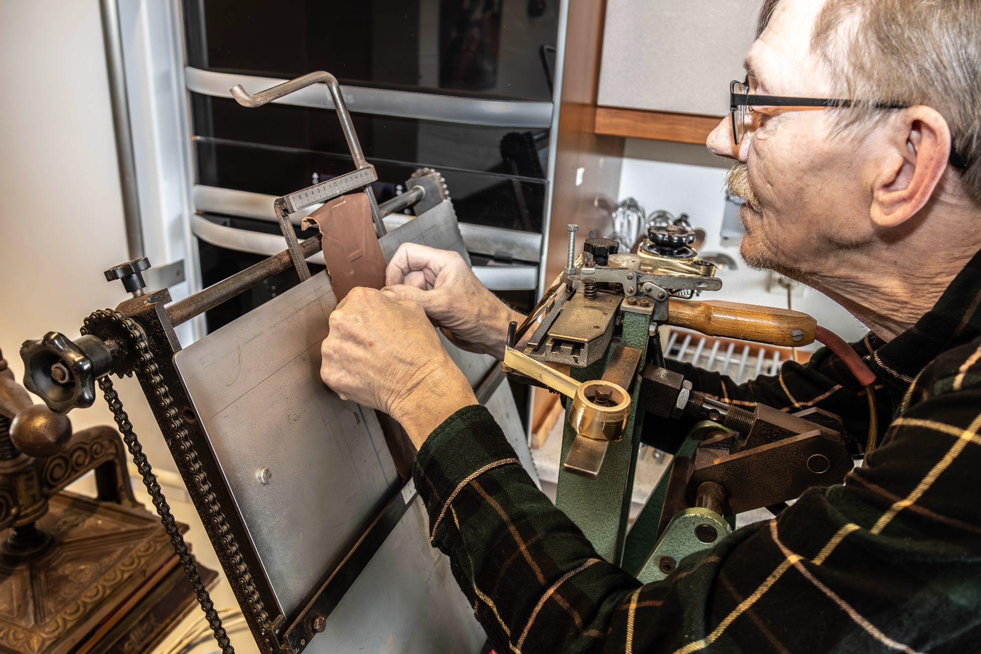 Det er Erik, der betjener forgyldermasknen, hvor han påfører bøgernes titler med guldbogstaver. Foto: Jim Hoff