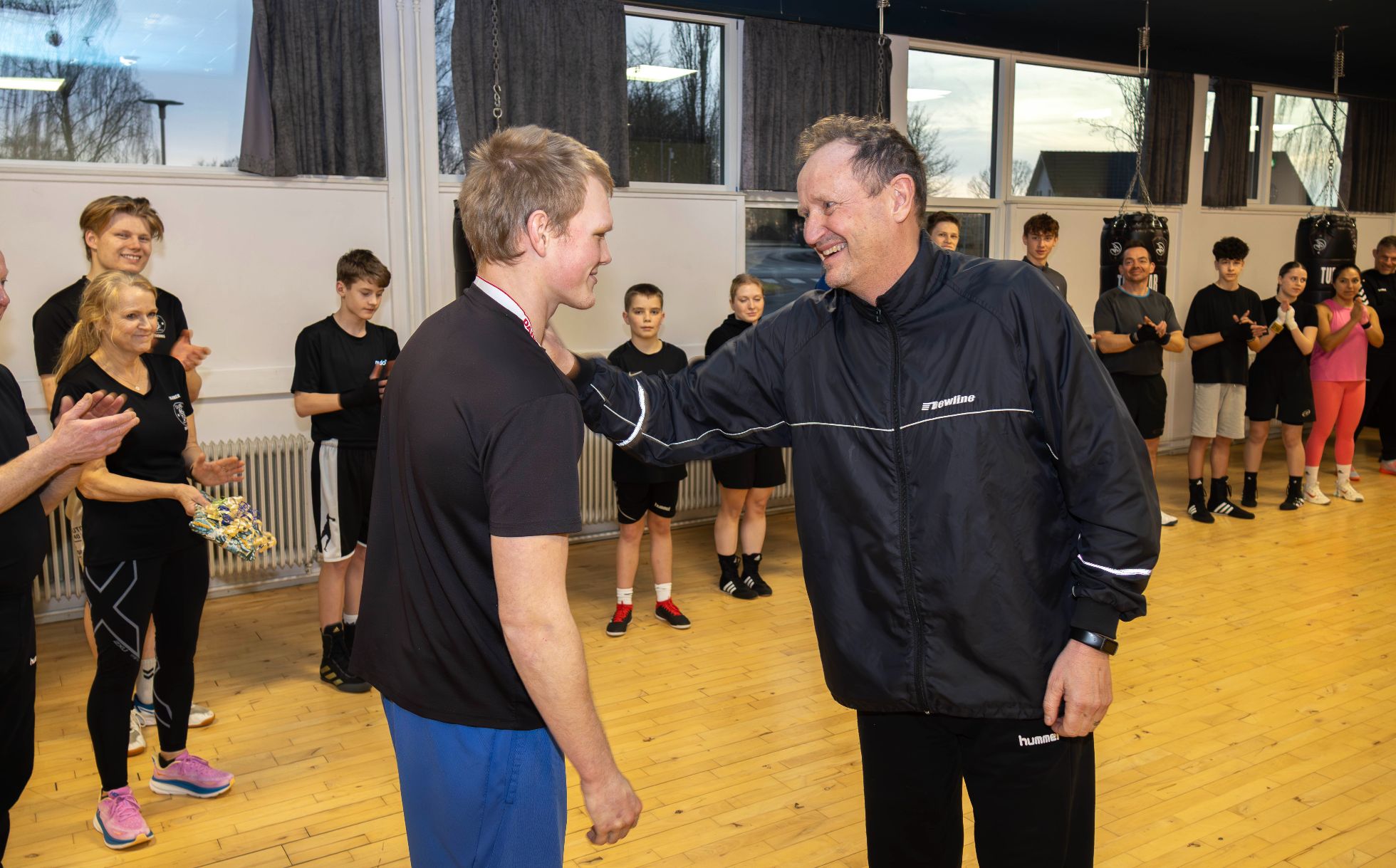 Mathias Holdt blev fejret på behørig vis tirsdag aften i bokseklubben, hvor der var flotte ord til den unge mand fra Wirenfeld, klubbens formand Peter Vilstrup og boksetræner Margit Weber. Alt sammen i en propfuld boksesal, hvor unge boksere, forældre, bokseledere og Mathias’ forældre belønnede den herlige bokser med det store fighterhjerte med stående bifald og tonsvis af high fives.