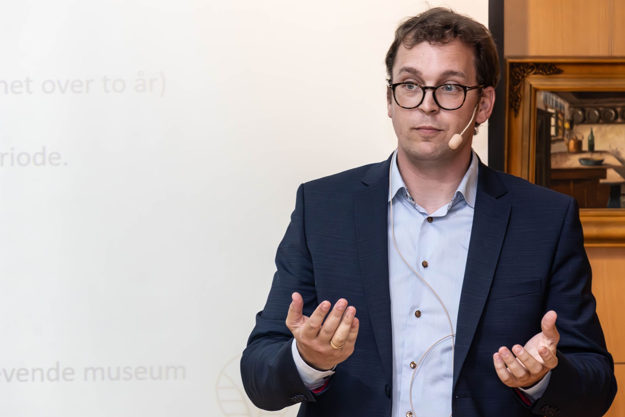 Museumsleder Mathias Christiansen varslede forhøjede entrepriser og en annullering af årsskriftet som en del af den økonomiske redningsplan. Derudover var der masser af spændende visioner for fremtidige tiltag på museet. Foto: Jim Hoff