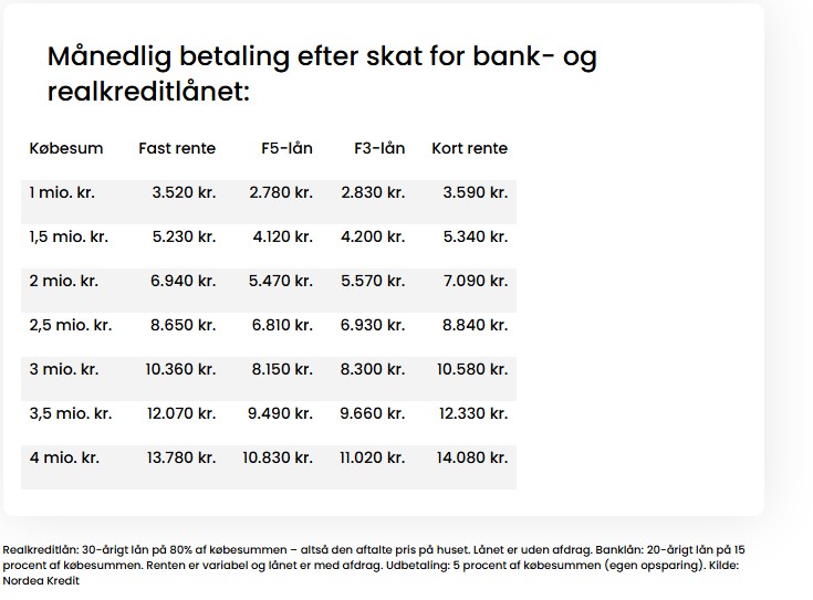 Et gennemsnitligt hus på 140 kvadratmeter koster 2,3 millioner lige nu, viser beregningerne fra Nordea Kredit. Det vil som udgangspunkt koste omkring 8. 000 kroner i månedligt betaling ved en standardfinansiering, hvor man kombinerer et 30-årigt fastforrentet lån med et variabelt forrentet banklån, og dét vil altså næppe ændre sig synderligt i de kommende måneder. I tabellen nedenfor kan man få et fingerpeg om, hvad der skal til at for at finansiere boligkøbet.