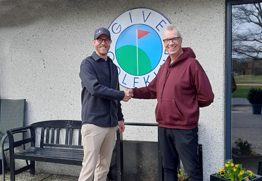 Her er det golfklubbens bestyrelsesformand, Stephen Bihl der hilser Andreas Thune Hansen velkommen under fanerne i Give Golfklub. Foto: Give Golfklub