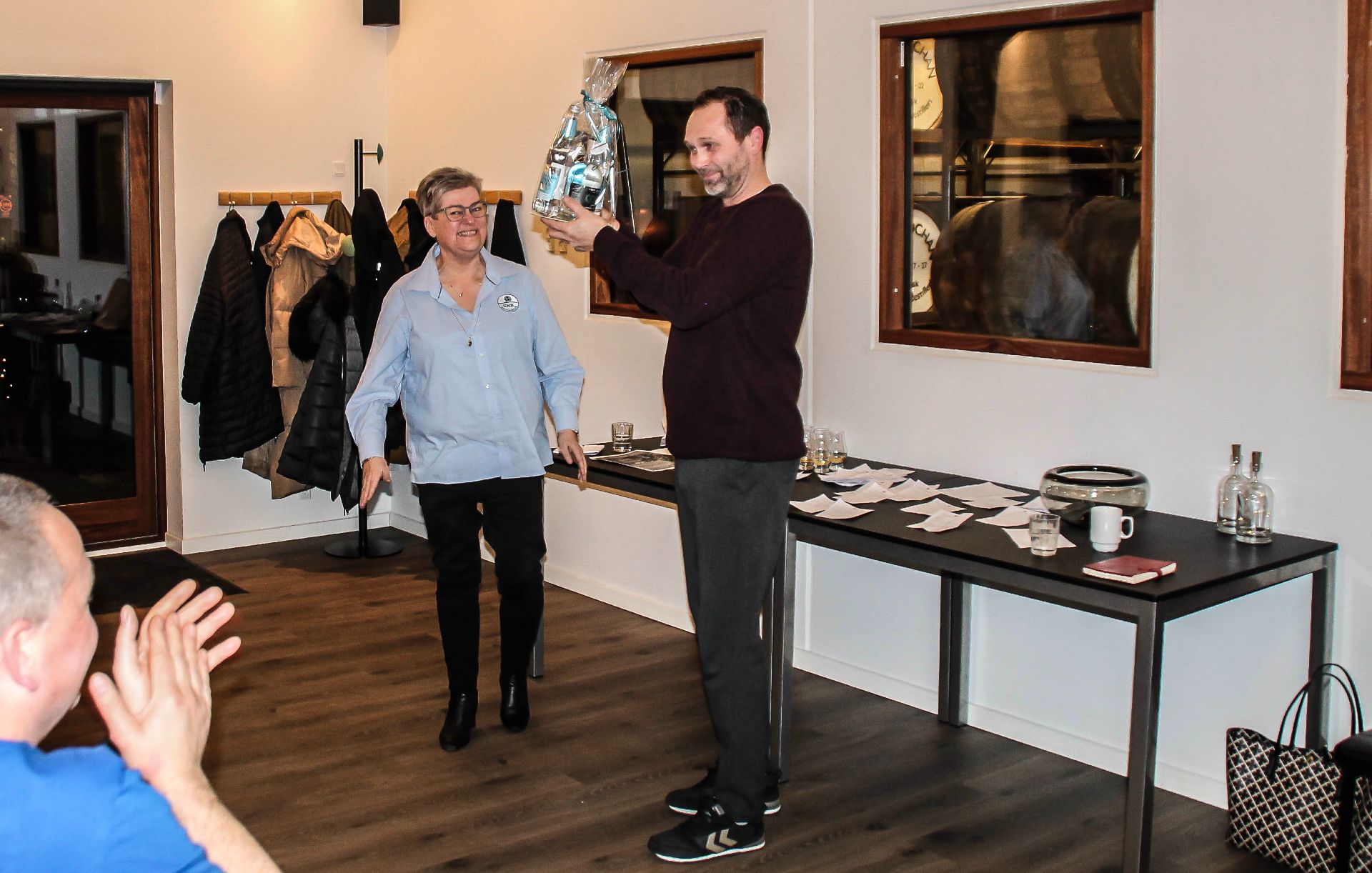 Der var naturligvis en fin gave til Lars Christiansen efter det fine foredrag: Lækker gin fra Fary Lochan. Her er det Hanne Lund fra erhvervsklubben, der får æren af at overrække gaven til Lars. Foto: Søren Grunnet