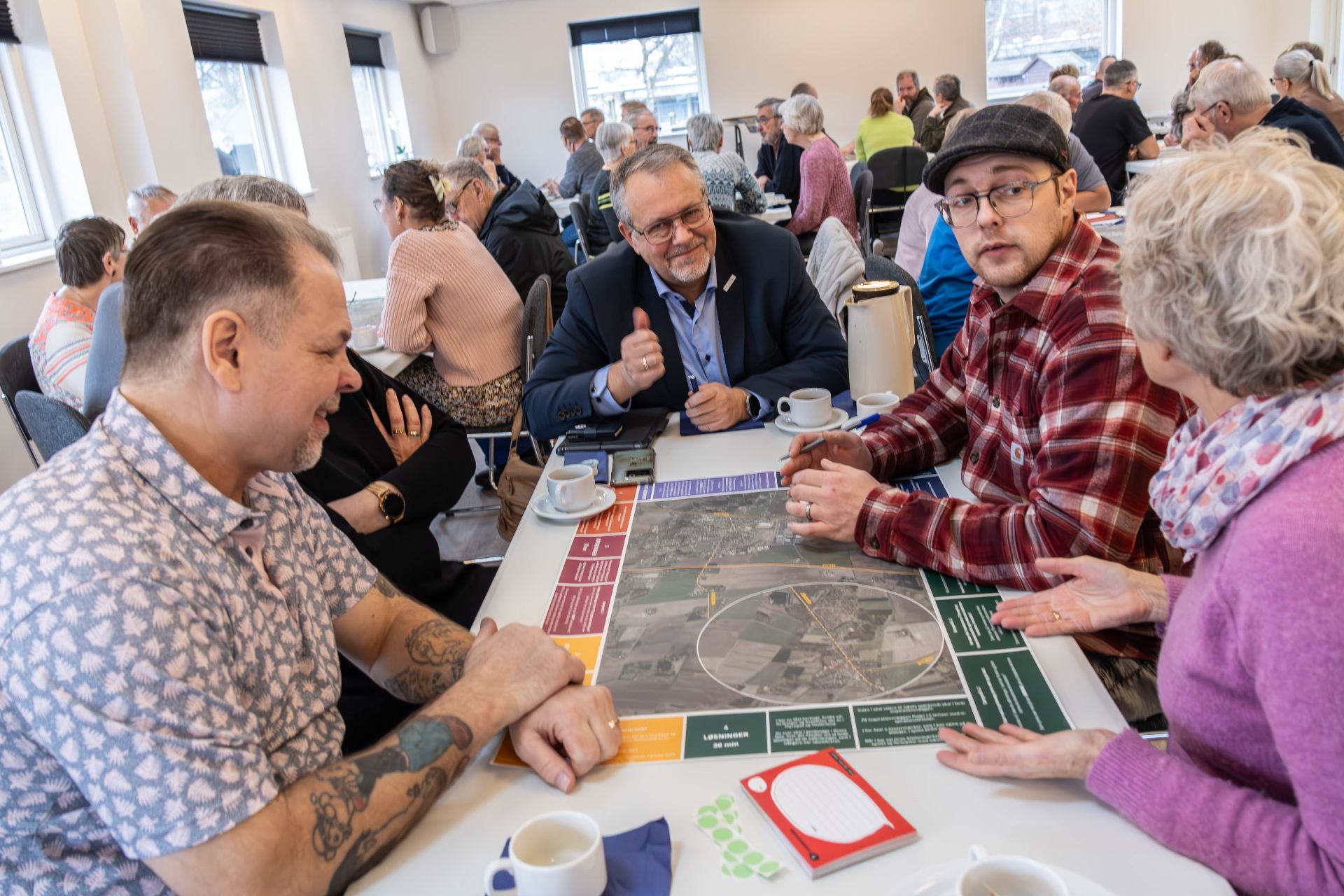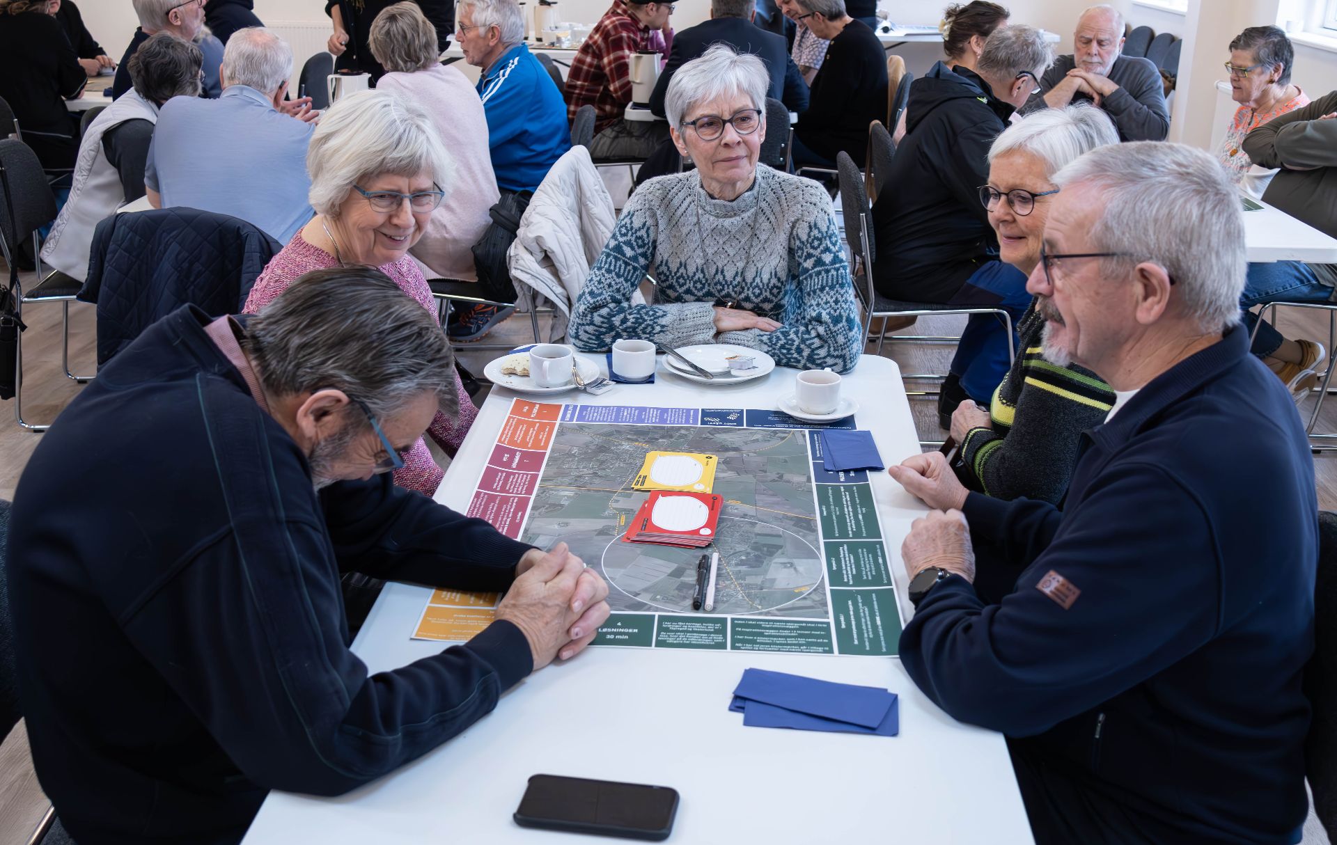 Jean Darly (tv.) deltog selv i Arki-Nopoly-spillet, blandt sammen medområdets folketingsmand, Kenneth Fredslund (midt i billedet) fra Danmarksdemokraterne. Foto: Jim Hoff