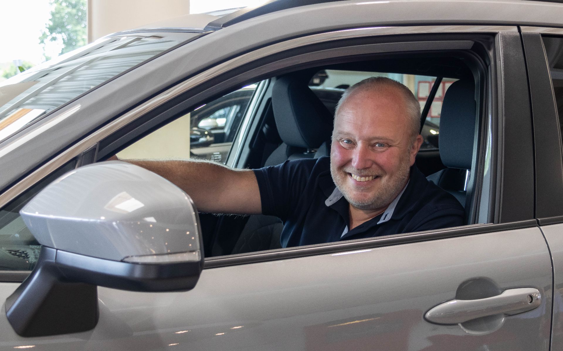 Afdelingschef hos AT Biler i Give Jes Abrahamsen har for fotografens skyld sat sig ind i en af de nye Toyotaer, der er på lager i butikken. Foto: Jim Hoff