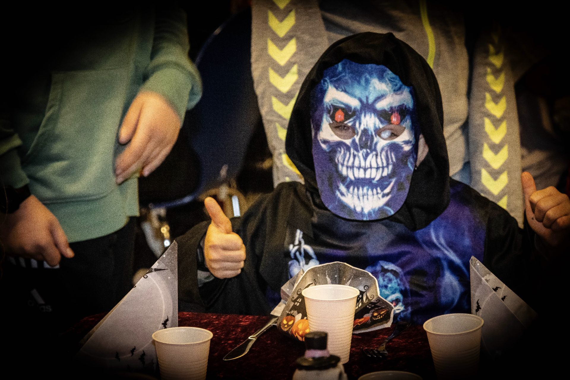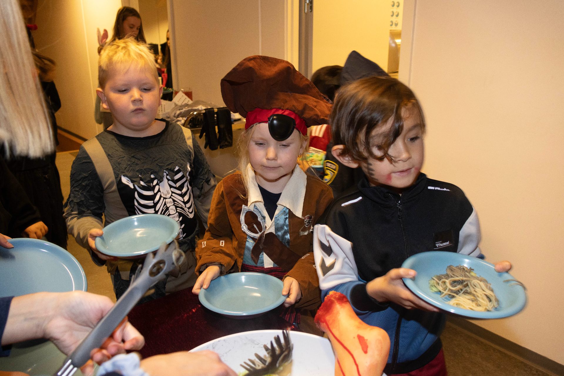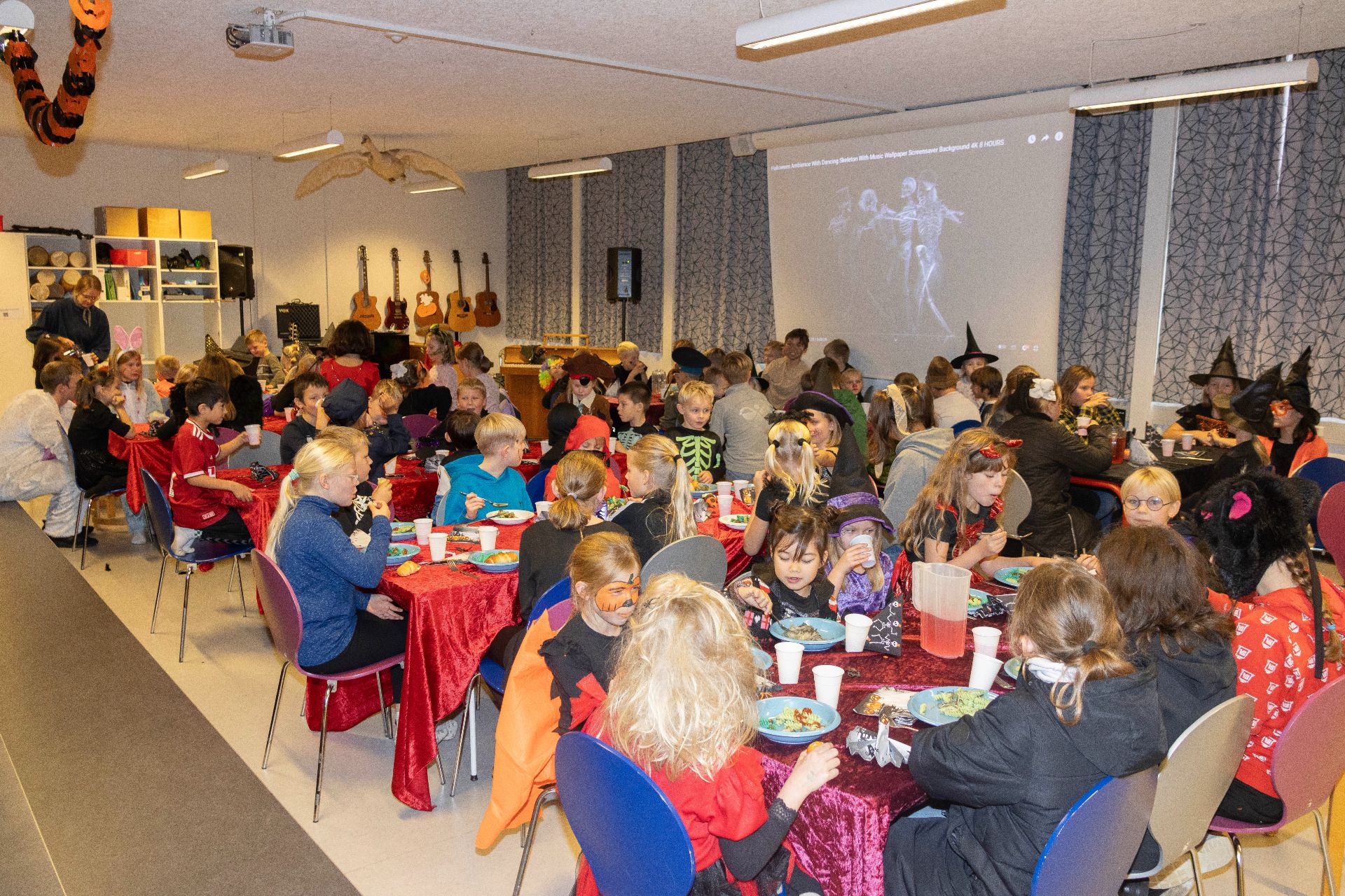 Når man får “fornemt og skrækindjagende besøg” af den slags personager, er det klogt at have mad på bordet, for ellers får skolens elevtal et gedigent nøk nedad. Derfor havde elever og lærere/pædagoger sammen stablet den helt store festmiddag på benene til dagens uhyggelige sammenrend af halloweengodtfolk.