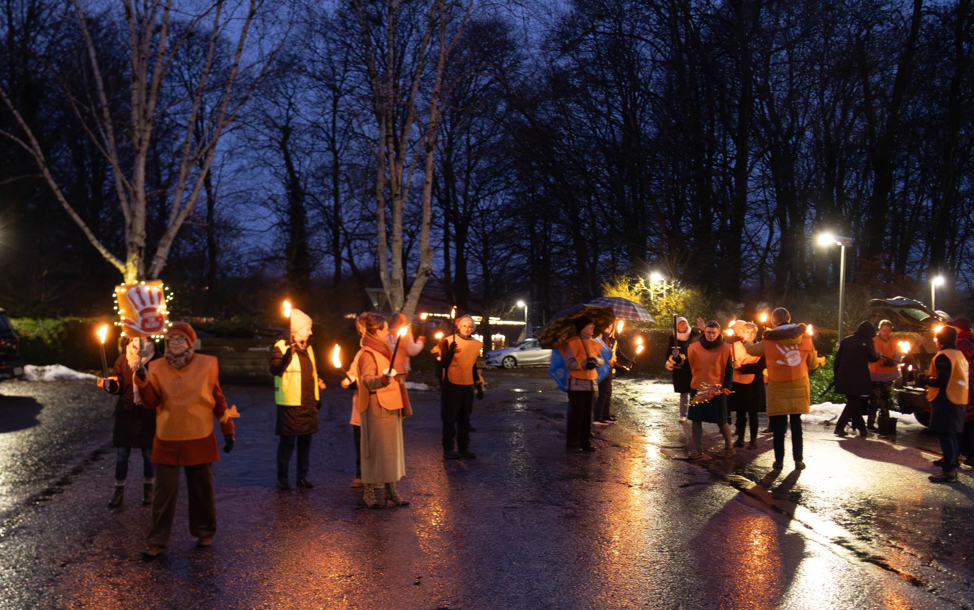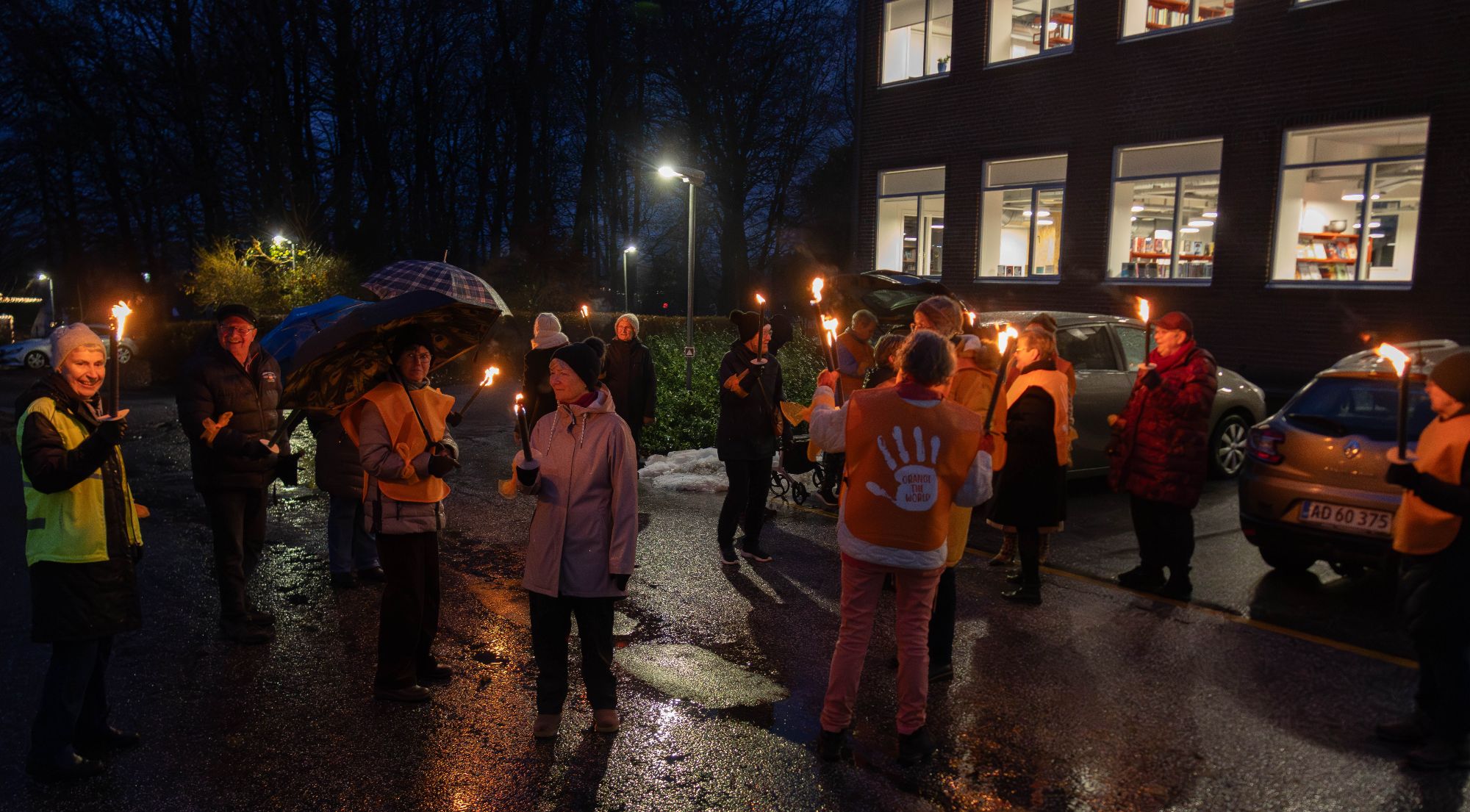 Fakkeltoget skulle markere og synliggøre en kampagne, der hedder ’Stop vold mod kvinder’, og fakkeltoget gik ned gennem Give Midtby, hvor 35 deltagere, 34 kvinder og én mand, iført orange veste, leverede et smukt og stemningsfuldt indtryk.
