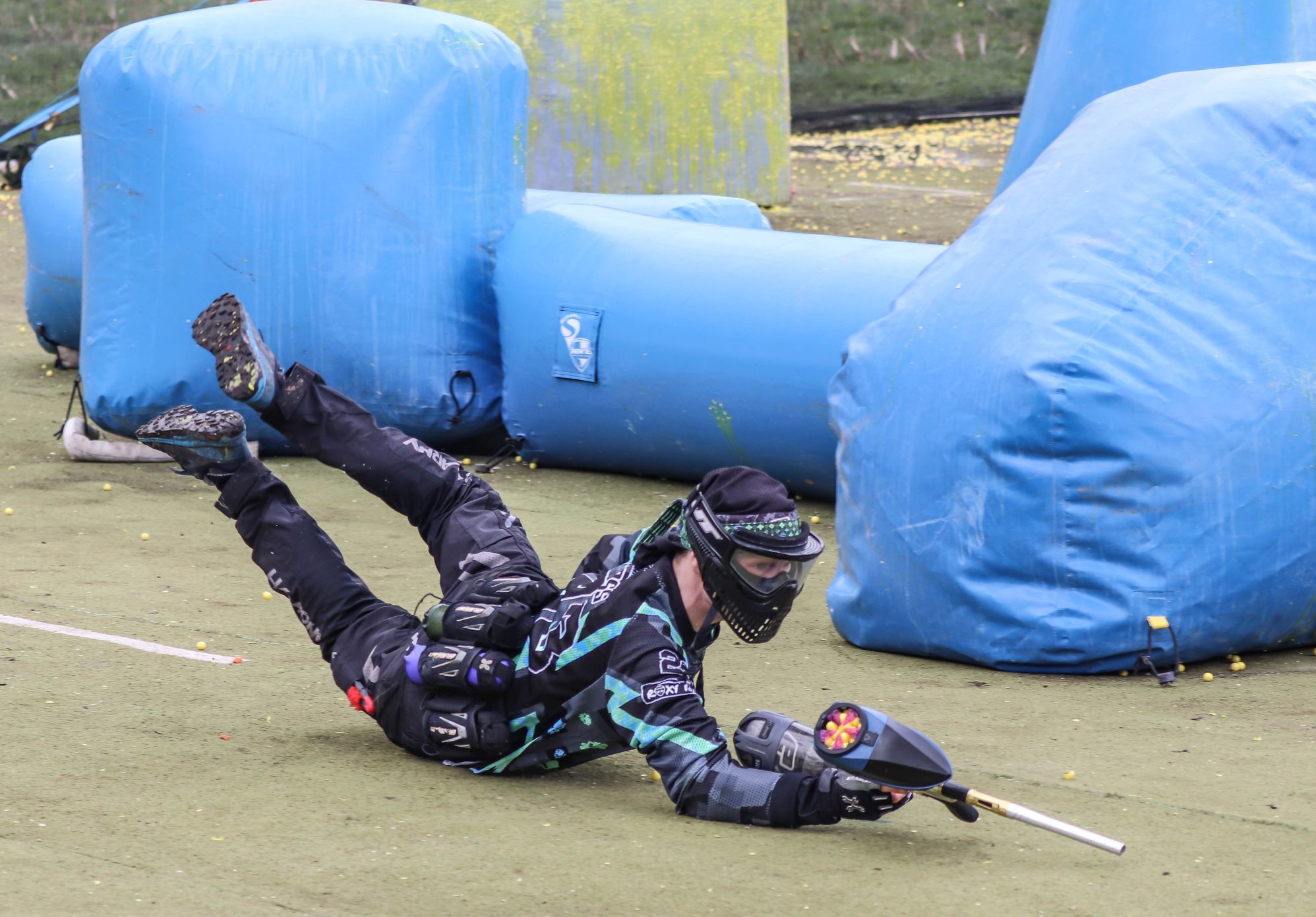 Paintballsporten kræver både kløgt, taktisk snilde og bevægelighed. Her et eksempel på det sidste. Foto: Midtjysk Event