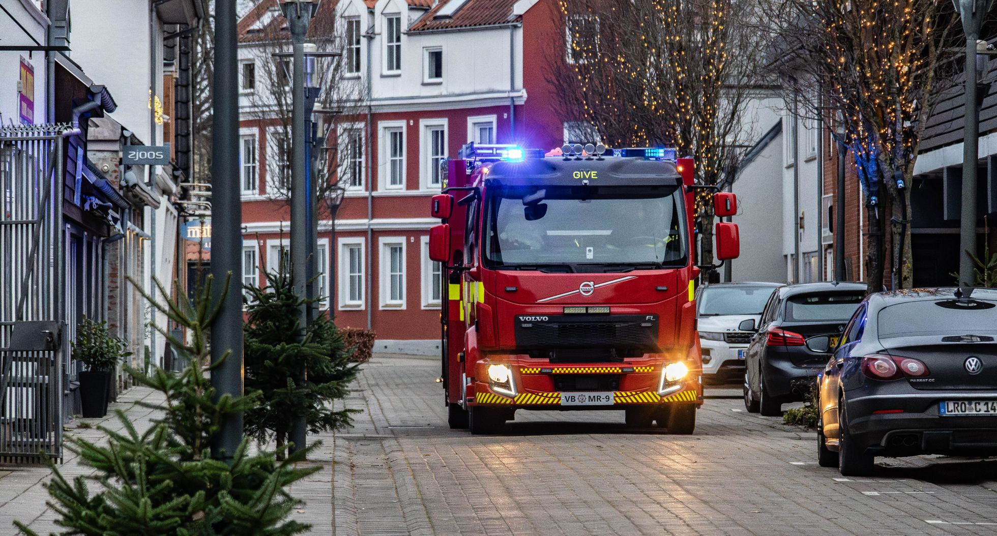 Der var ikke julemandens kane og Rudolf med venner, der forstyrrede bybilledet her. Næh, det var en skrigende rød brandbil med blå blink og udrykningshornet i bund, der kom susende ned mod denne forventningsfulde juleflok af gode folk fra Give og omegn. What! Var der mon gået ild i juletræet eller var det fredag aftens mange brandtilbud, der lå og ulmede stadigvæk?