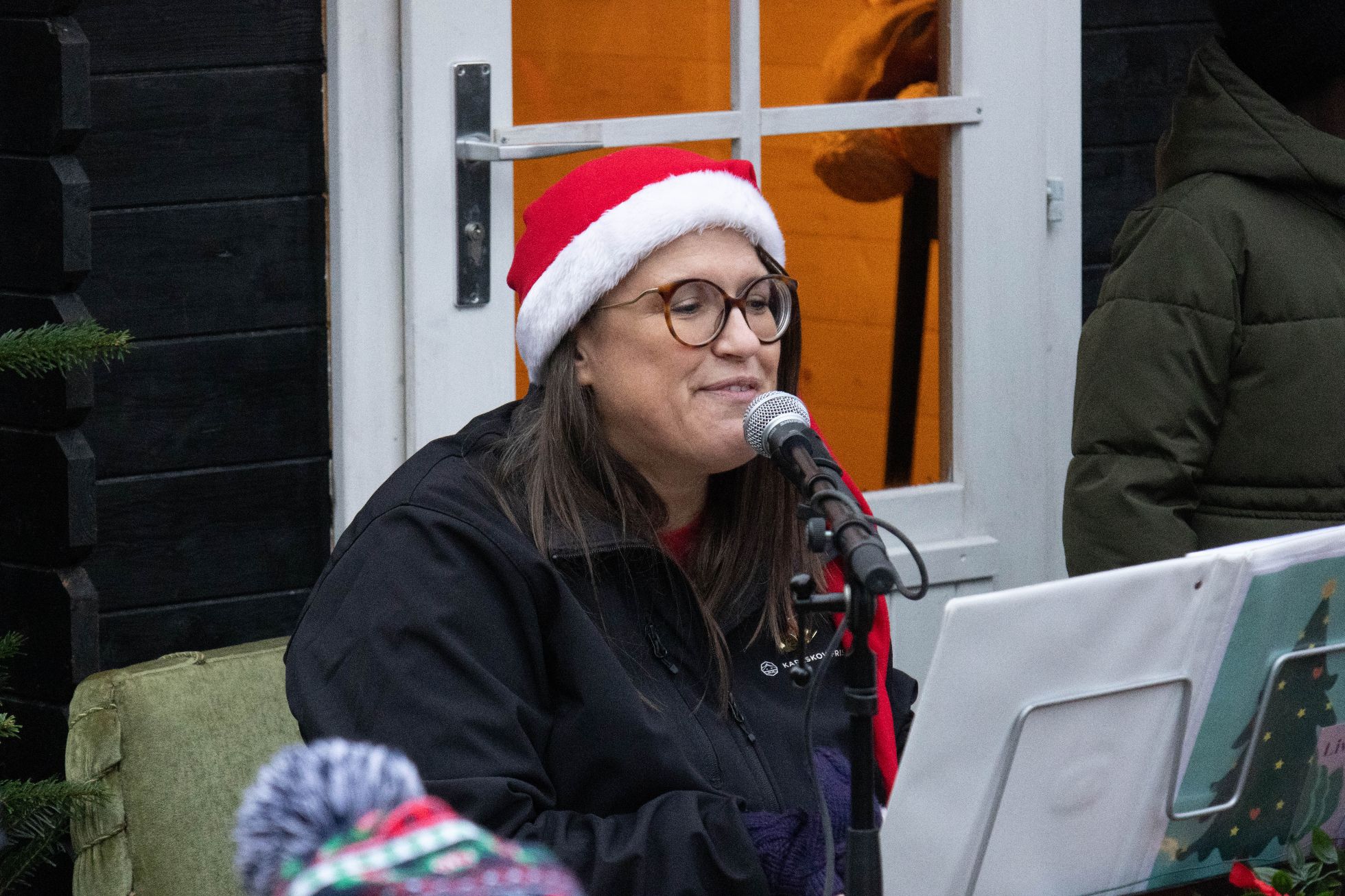 Elsebeth Lindegaard var 200 procent i julehopla og leverede en masse dejlig julemusik til juletræstændingen i Give. Foto: Jim Hoff