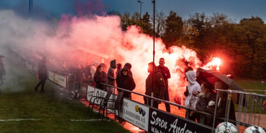 Foto: Da Rask Mølle bragte sig foran 3-1 brød der en sand romerlys-storm løs på Rask Møllelangsiden, der havde tæt på 200 tilskuere med til den vigtige kamp i Give, mens Givefolket fyldte tribunen. Dermed en fed kulisse for spillere at spille i. Foto: Jim Hoff