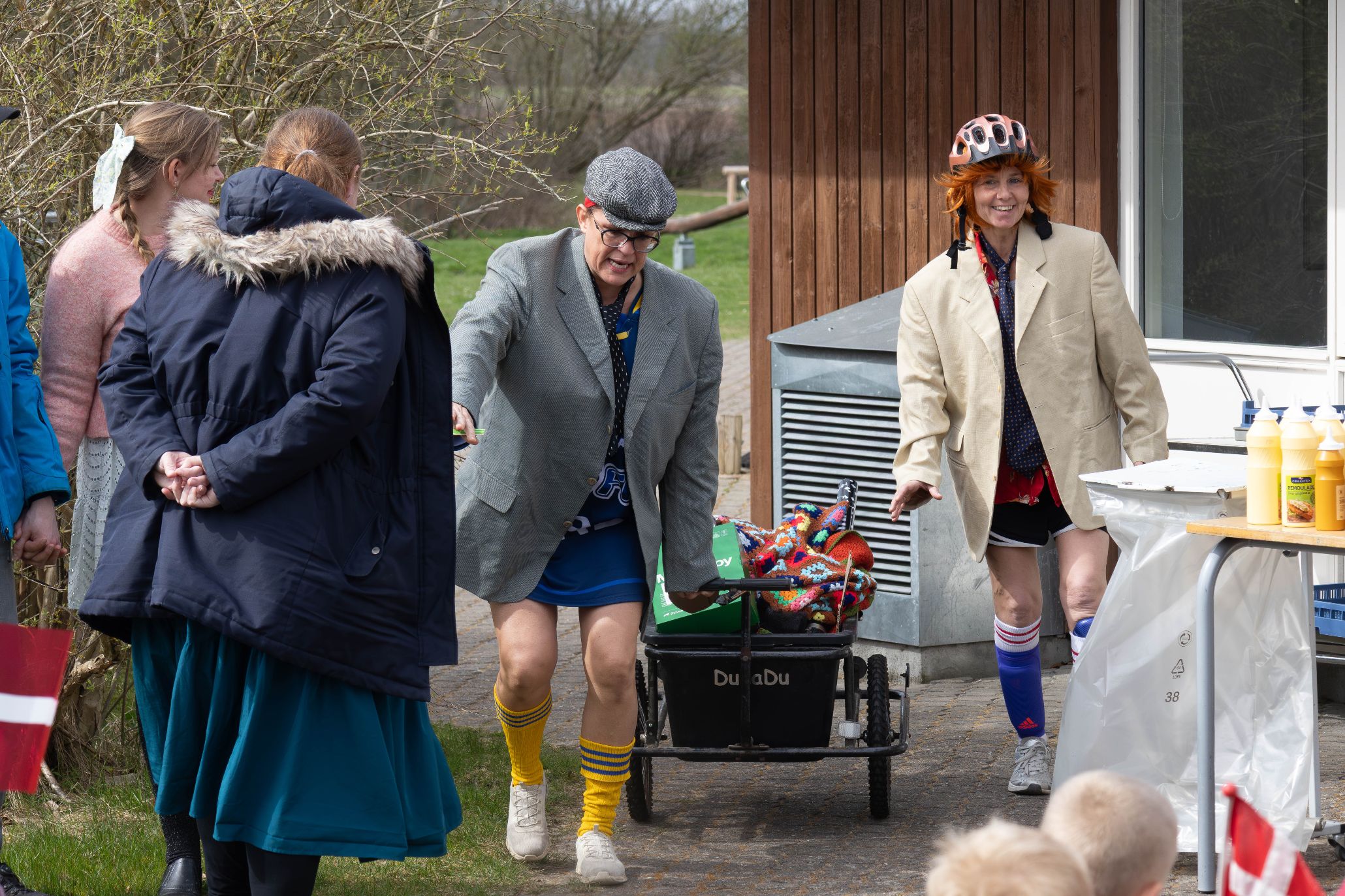 Hvis man kiggede godt efter, kunne man nu godt ane, at de to ’mænd’ var en slags feminine hunulve i fåreklæder - i hvert fald lød det fra et par skarpsindige gutter fra 2. klasse, at ”det er sgu’ da Elsebet og Annette, der har klædt sig ud”. Godt spottet, boys!