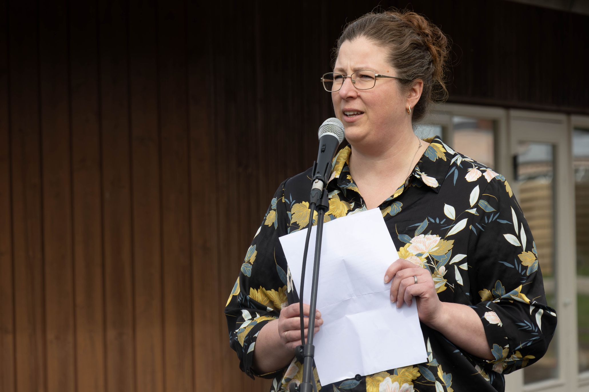 Næstformanden i skolebestyrelsen ved Karlskov Friskole, Anja Ry Milton, holdt en fin tale, hvor hun roste det lokale fællesskab for at muliggøre opførelsen af to multibaner og en tarzanbane. Foto: Jim Hoff