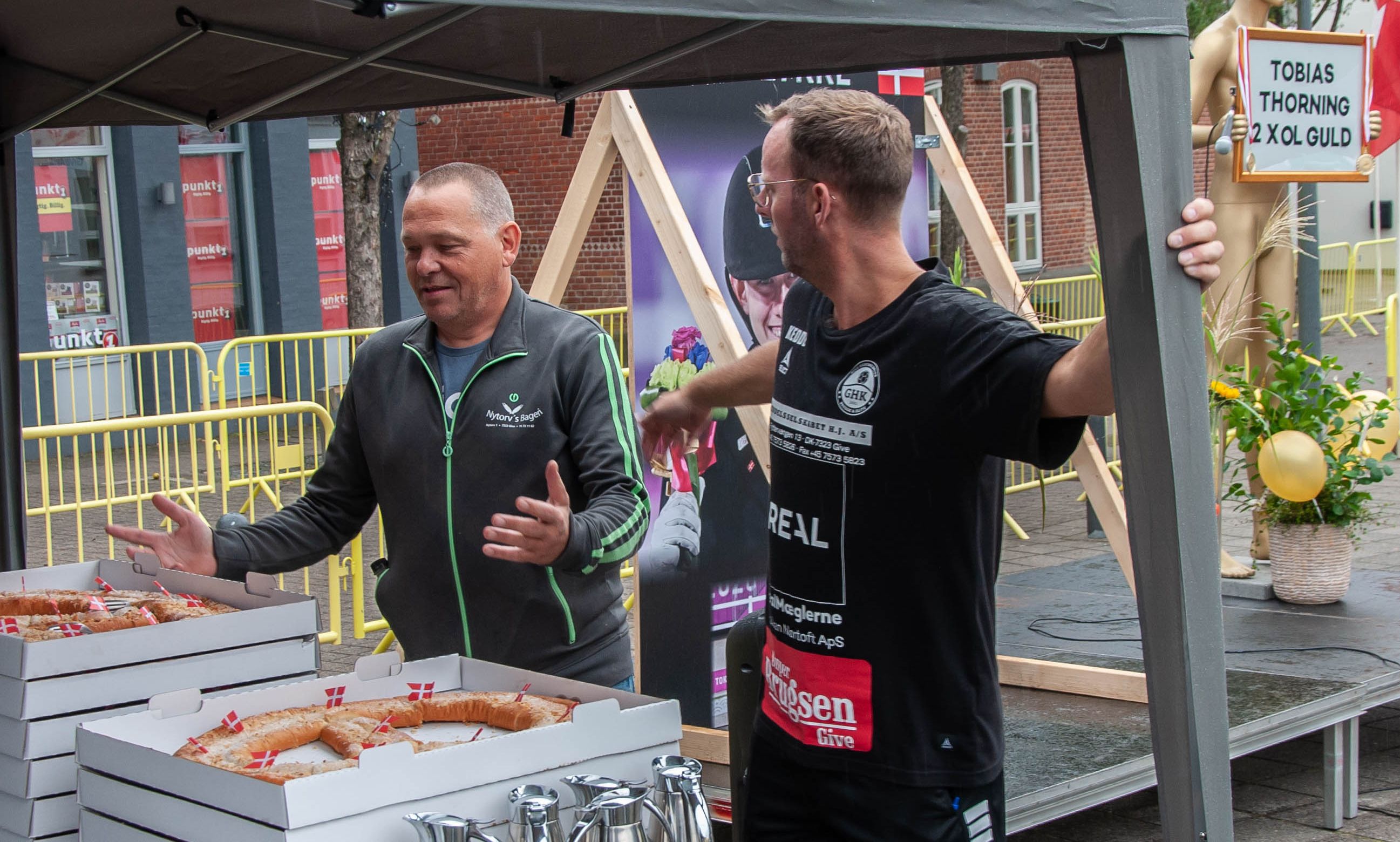 Kedde Jensen har også involveret sig i bylivet i Give ved diverse events. Her deler han guldkringle ud sammen med Poul Erik bager. Foto: Jim Hoff