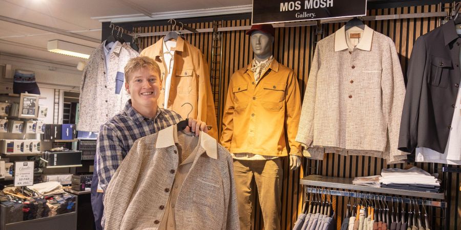 DET GODE BUTIKSLIV: Andreas Lassen, der er elev hos Din Tøjmand i Give, har snart udstået sin læretid på 2 år, og i den forbindelse skal han lave en fagprøve og efterfølgende op til eksamen i fagprøven. Det betyder, at han har valgt at fokusere på det danske modebrand, Mos Mosh Gallery, i butikken i uge 18.