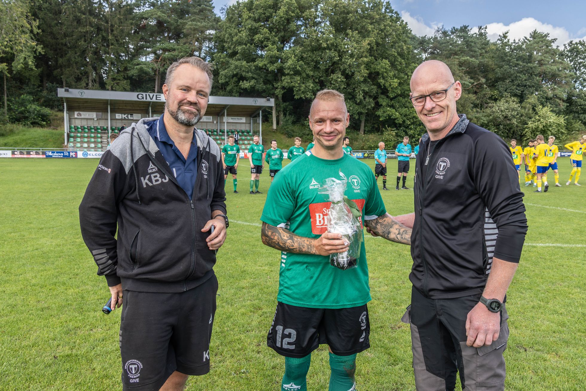 Gives cheftræner Kasper Bach-Jensen (tv.) og klubbens formand, Anders Kristensen, holdt begge en flot tale for klublegenden Peter Christensen i anledning af hans flotte 300-kamps milepæl. Foto: Jim Hoff