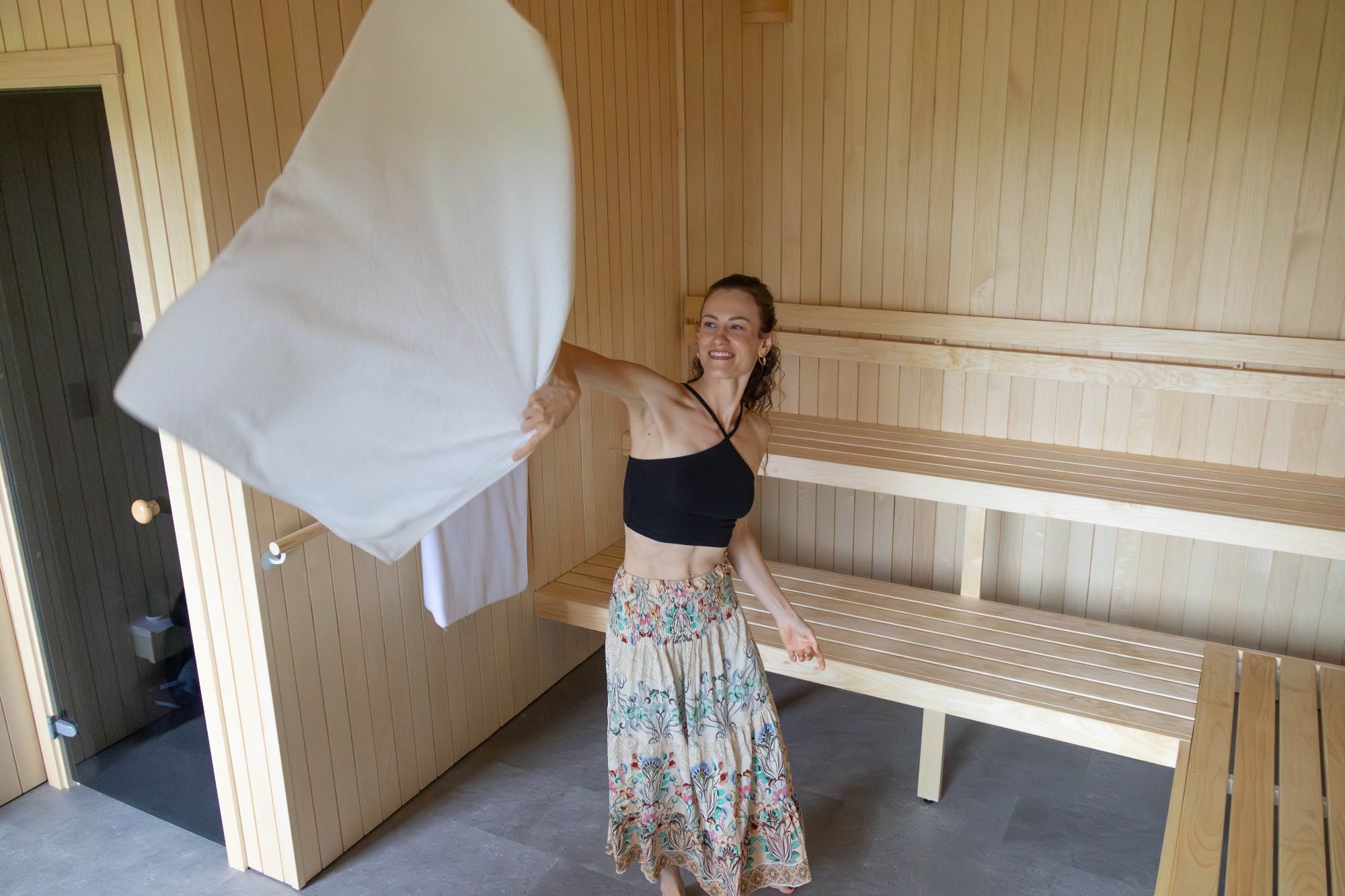 Foto 2: Hos Villa Vindblad tilbydes der også saunagusbehandlinger i et helt nyt og lækkert sauna-setup - og Cecilia elsker det, som vi kan se her. Foto: Jim Hoff
