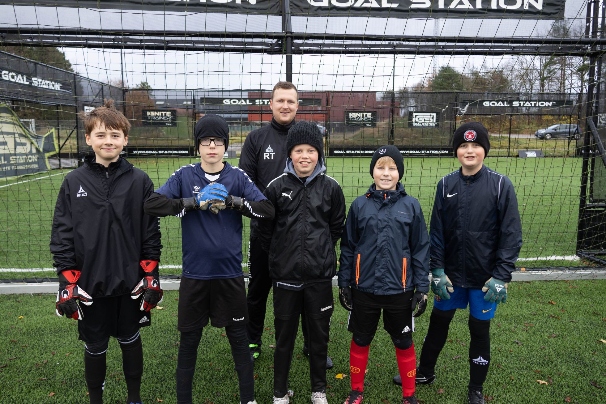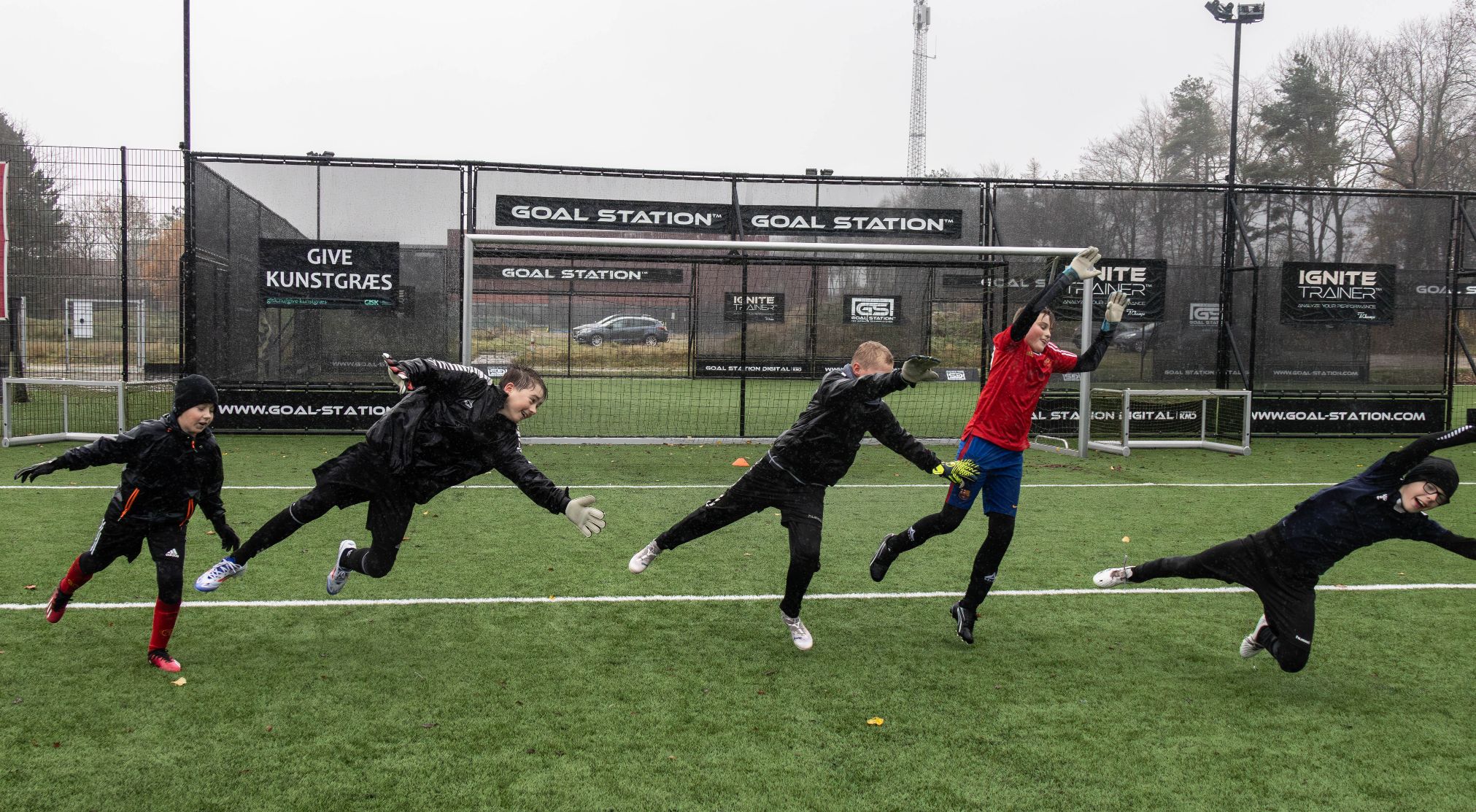 Vejret viste sig ikke just fra sin bedste side, idet regnen faldt ned over det fine anlæg, samtidig med at der gik en frisk vind henover banen. Men det var nu ikke noget tema for de herlige unge knægte Esben, Noah, Liam, William og Magnus, der alle var klar til en times undervisning i basale målmandsteknikker.
