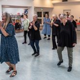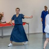 Så er der slut med snakkeriet. Nu er det bentøjet, der skal tale. Kirsten kalder hele banden ud på gulvet, tænder for musikken – og så er det ’A Bar Song’ med Tipsy, der sætter takten for de følgende manøvrer med indøvede trin, hurtige klap og snurrige vendinger på det dansevenlige linoleumsgulv.