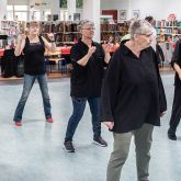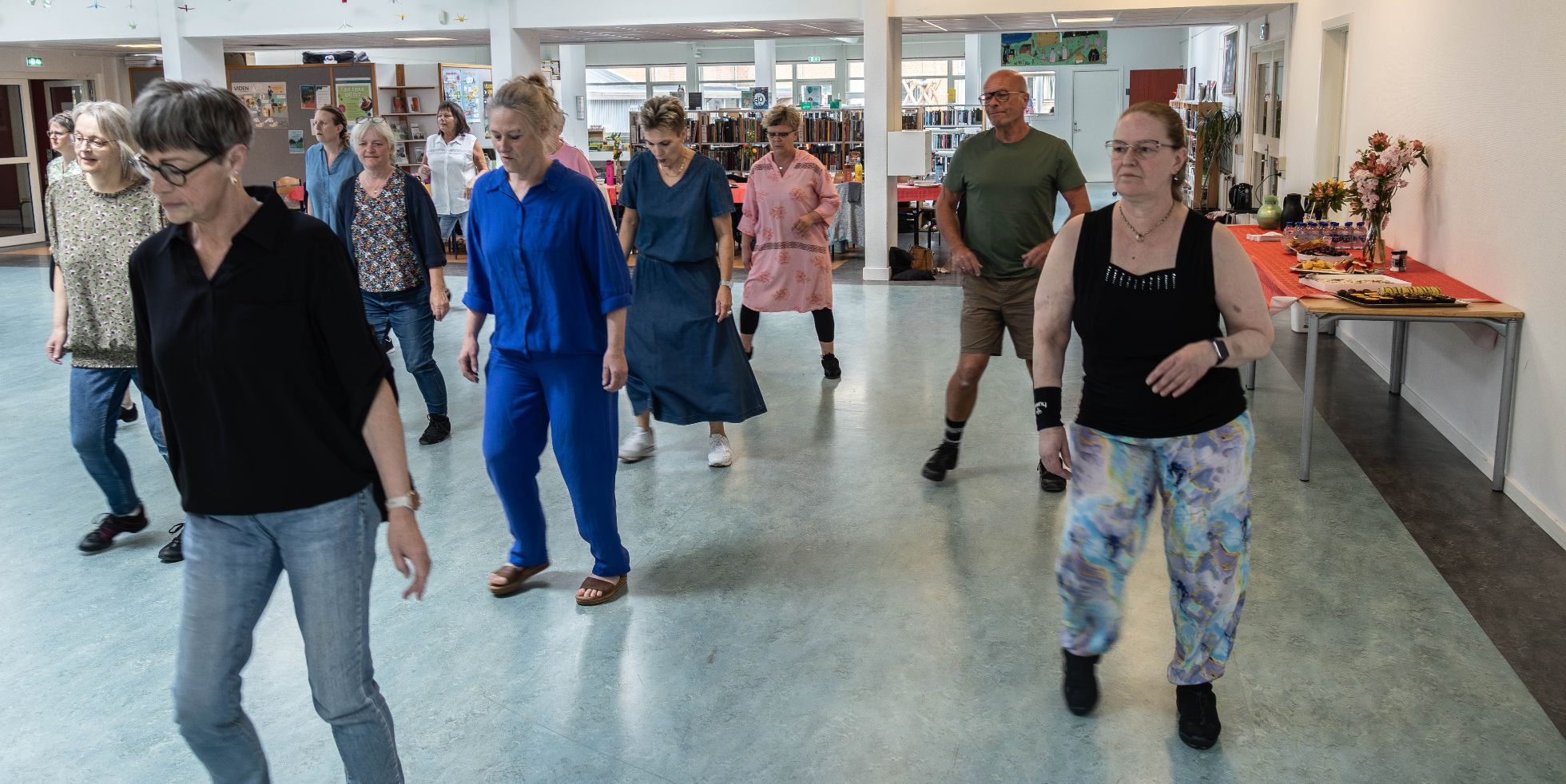 Vi befinder os som sagt i det store fællesrum ved biblioteket på skolen i Thyregod, og denne dag, lørdag den 26. april, kan ’Crazy Feet Linedance’ såmænd fejre 20-års jubilæum.