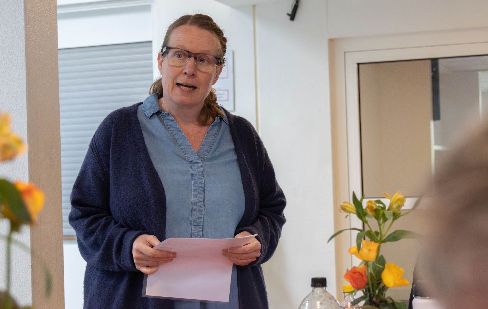 Formand Vibeke Thomsen indledte dagens jubilæumsfest med en fin tale om historikken bag Crazy Feet Linedance - og efterfølgende skete der så ting og sager på dansegulvet. Foto: Jim Hoff