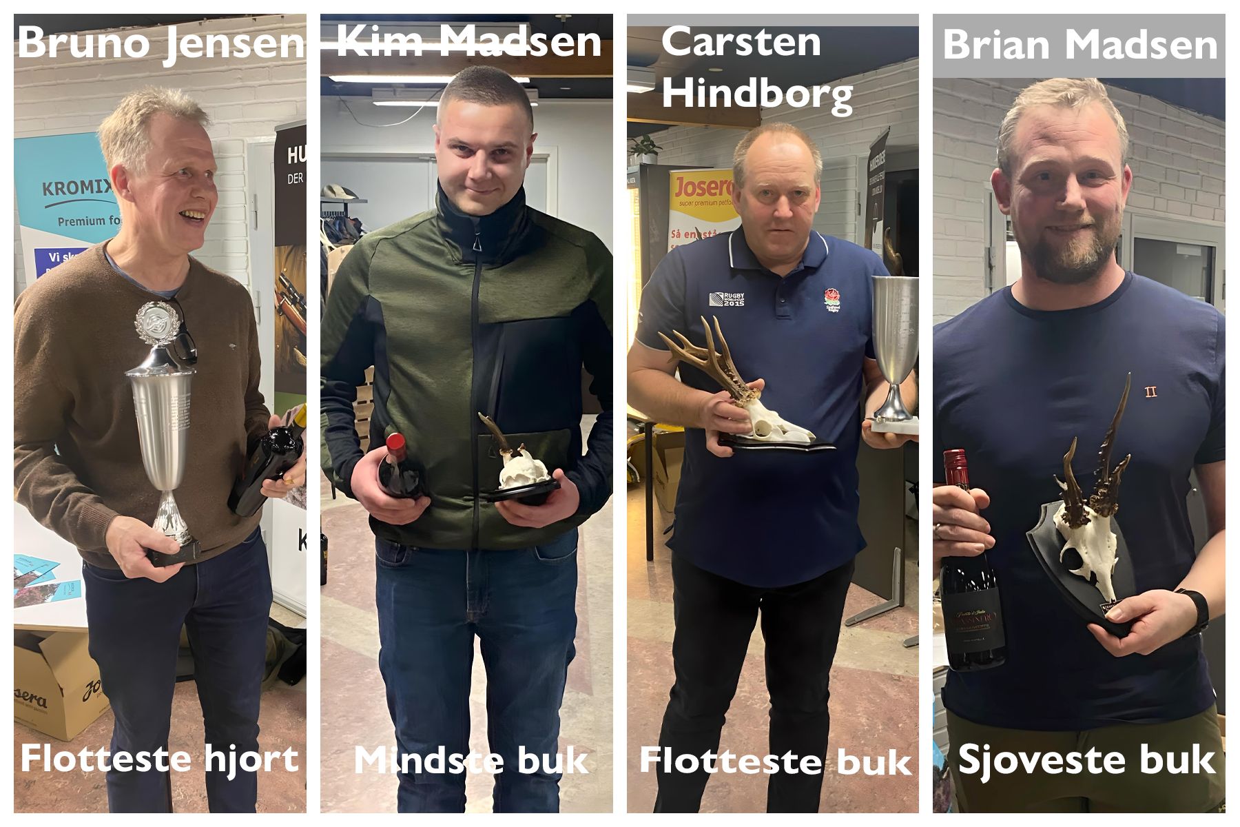 Her vandt Bruno Jensen trofæet for ’flotteste hjort’, Carsten Hindborg tog prisen for ’flotteste buk’, Brian Madsen hentede prisen for ’sjoveste buk’, mens Kim Madsen fik pokalen for ’mindste buk’ med hjem.