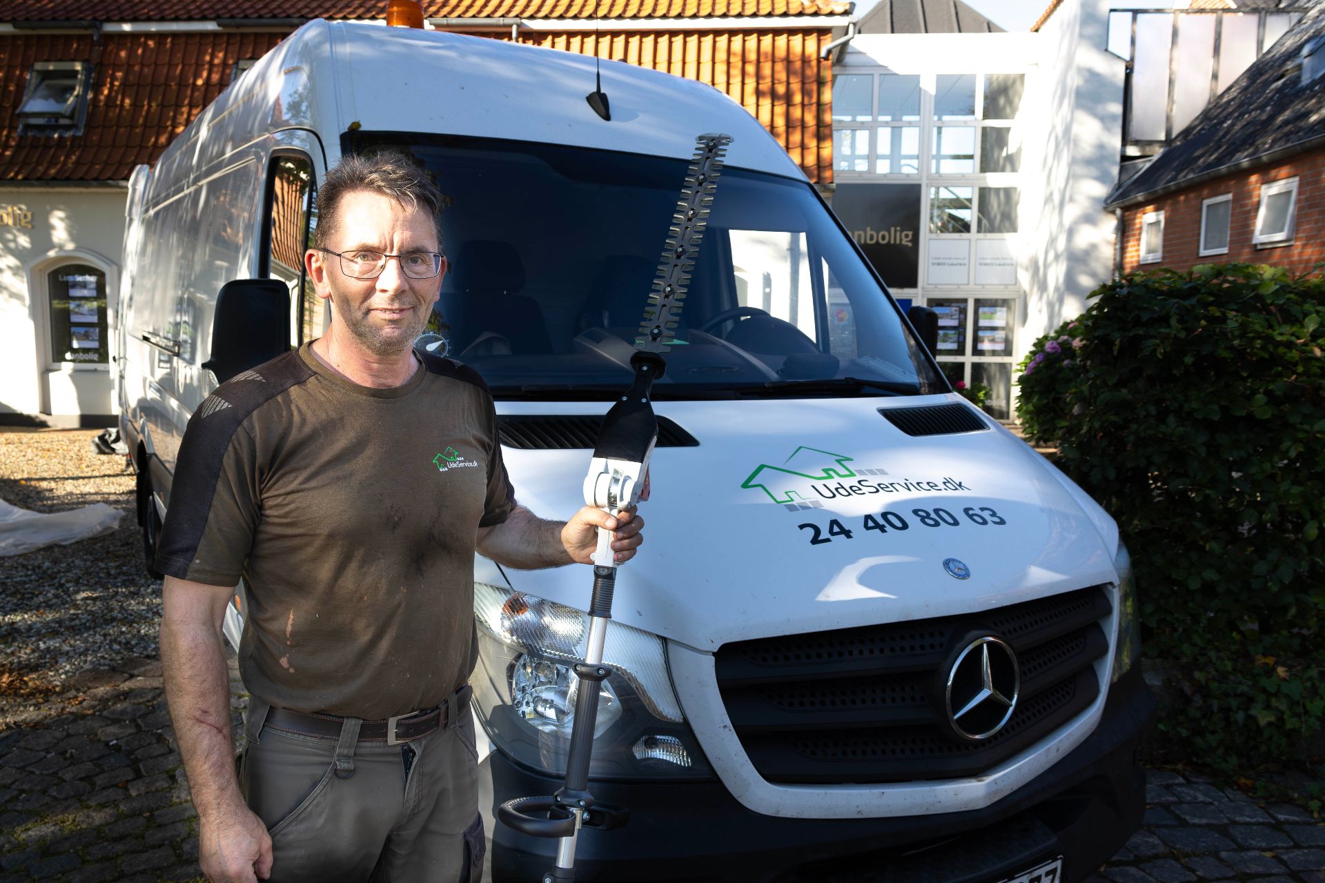 Det er Michael Wulff Pedersen fra Give, der ejer firmaet. Han har været i gang med Udeservice.dk i 8-9 år, og med tiden er hans maskinpark blevet mere og mere grøn, forstået derhen, at han mere og mere bruger batteridrevne maskiner til eksempelvis hækkeklipning.