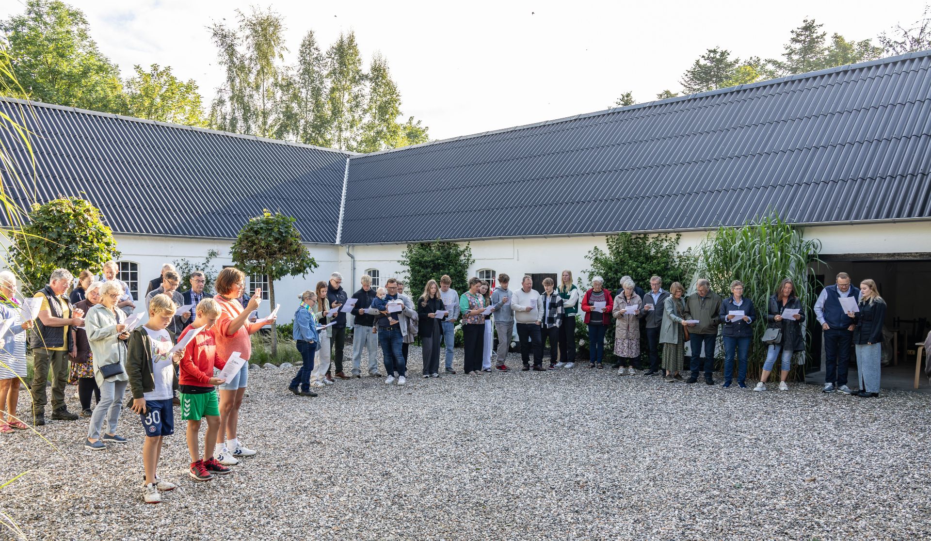 Her tog Jesper opstilling tæt ved den smukke æresport, mens de fremmødte dannede en musikalsk halvcirkel med front mod gårdens hoveddør.