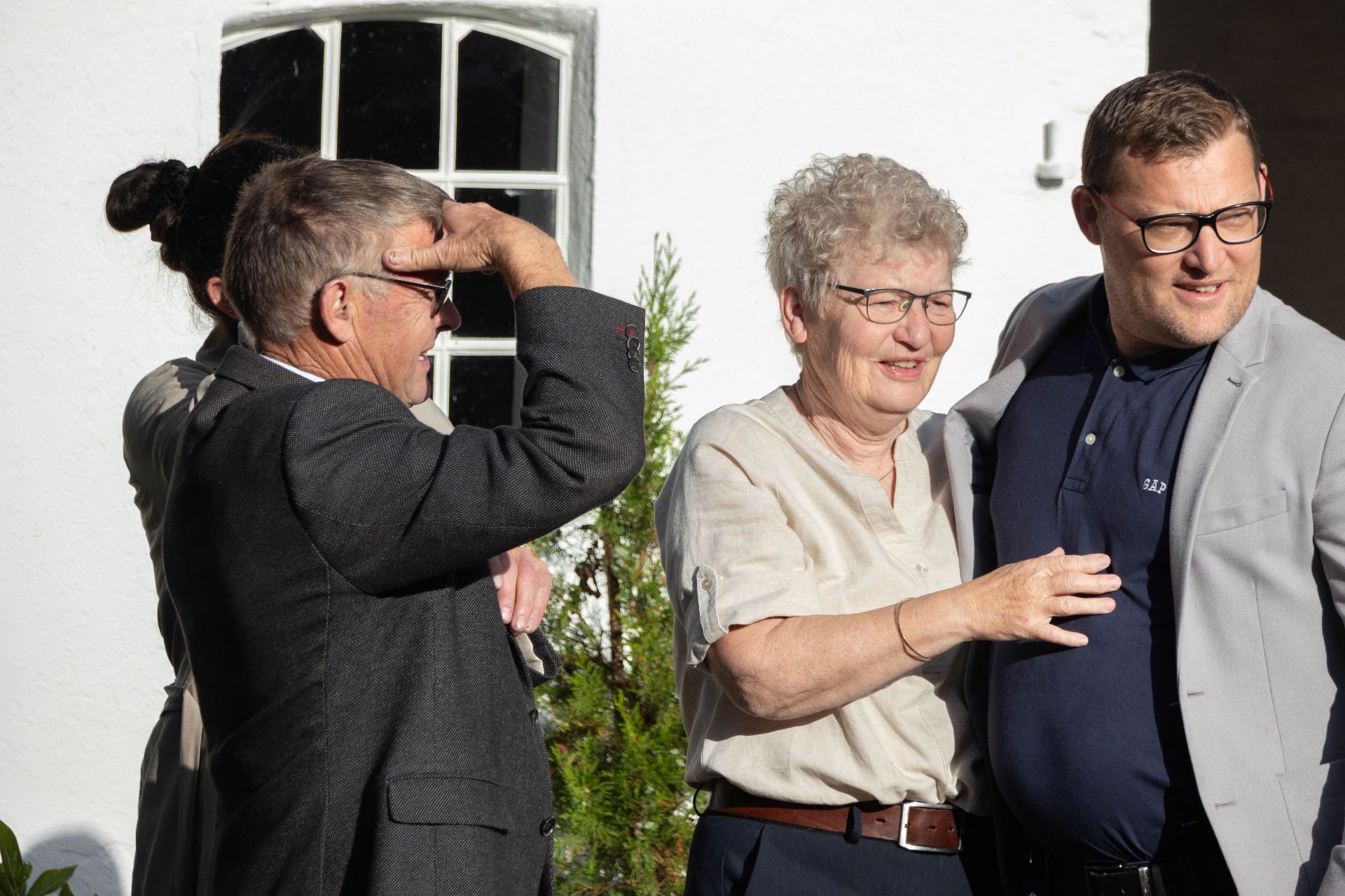 Dagens gæster blev høfligt hilst velkommen af Lise og Eriks søn Lasse Sørensen, og da klokken havde rundet 8.00 blev den spændte delegation, der nok rummede omkring 4 generationer, ført gennem den smukke have ved gården og om i den idylliske gårdsplads.