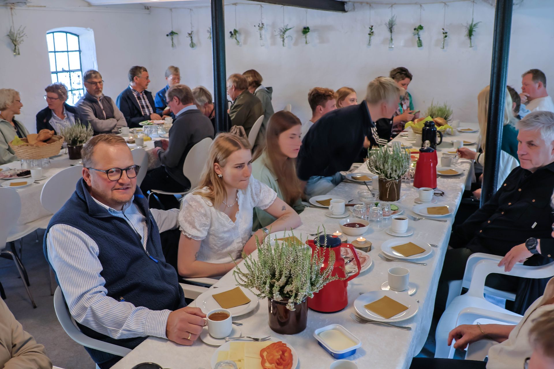 Og klar, det var kaffen nemlig med dertil hørende rundstykker i den festligt pyntede og hyggelige gildesal i en af gårdens længer. Her samledes flokken til morgenhygge som en slags god opvarmning til den store fest om aftenen – og der blev naturligvis hygget og snakket til den store guldmedalje, helt i dagens ånd og symbolik.