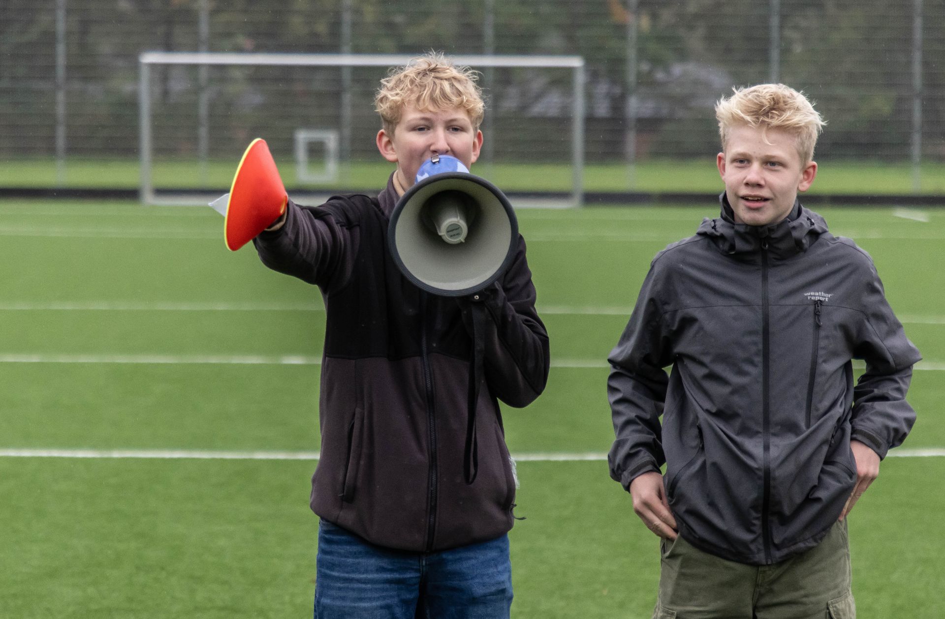 Selv om Vor Herre på dagen tænkte, at denne fine efterårsdag i motionens og samværets tegn lige skulle velsignes med lidt frisk isvand fra oven, var humøret ganske fint hos dagens ‘topatleter’, der inden dagens løjer gik i gang ude på den lækre kunststofbane, blev præsenteret for dagens program af et par oplagte stand-uppere fra 9. årgang, smiley.