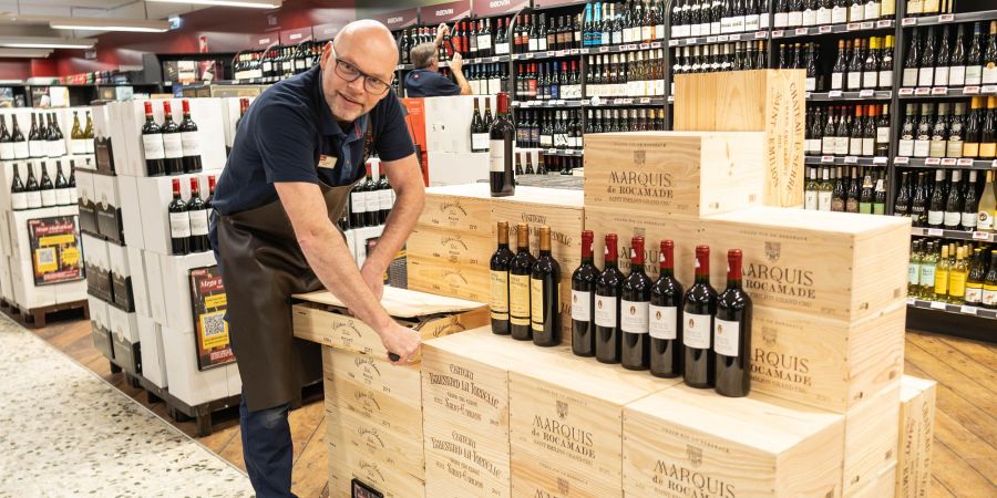 Foto: Lederen af Brugsens vinafdeling Michael Sørensen har i disse dage travlt med at pakke vinkasser op, så man kan blive klar til julevinsfestivalen, der starter torsdag den 4. december. Foto: Jim Hoff