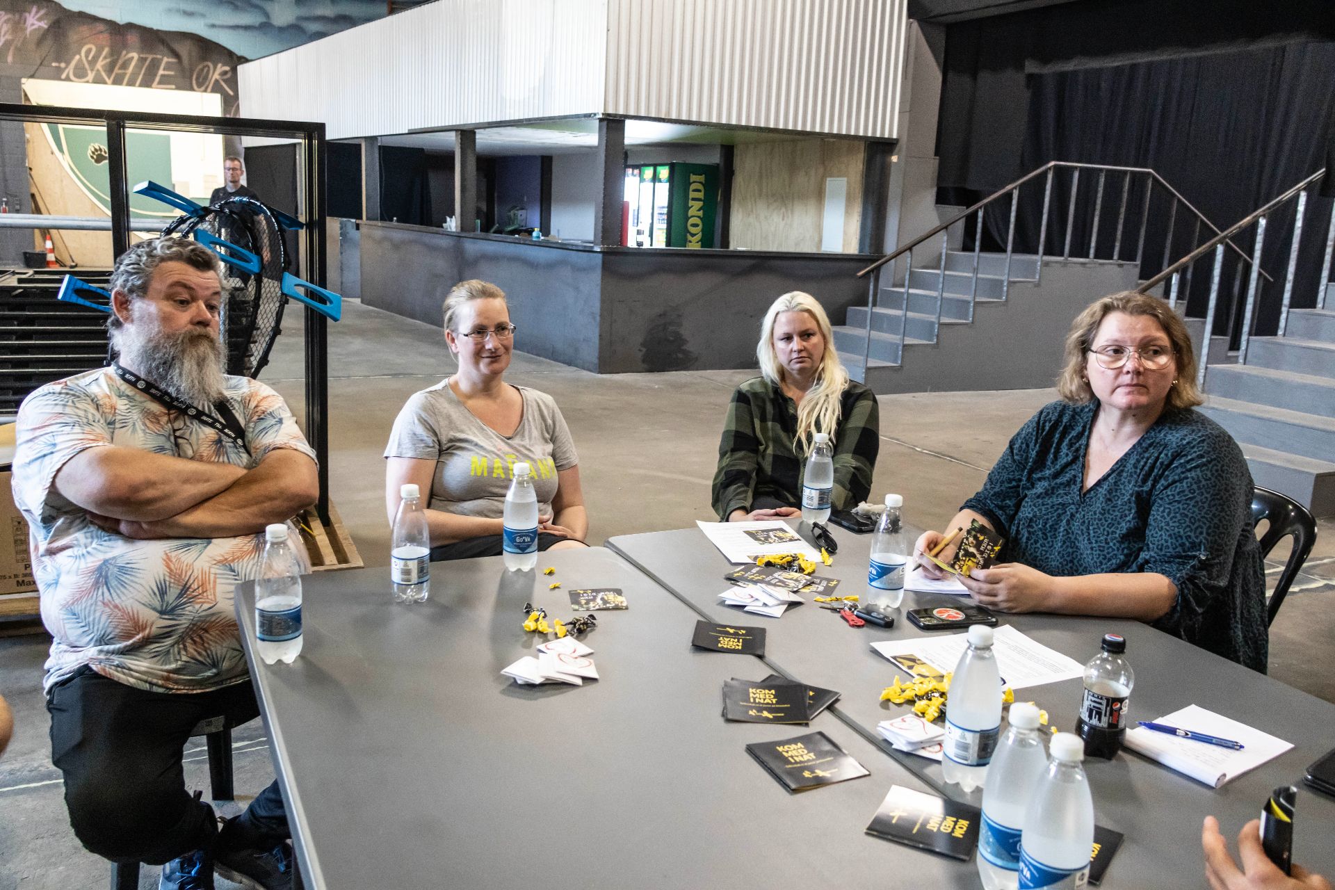 Jan Parsberg (tv.) og Jannie Jakobsen (th.) fra bestyrelsen i Urban Street Zone lyttede sammen med de to fremmødte brandeborgere opmærksomt til, hvad det er natteravnene kan hjælpe med i Brande.