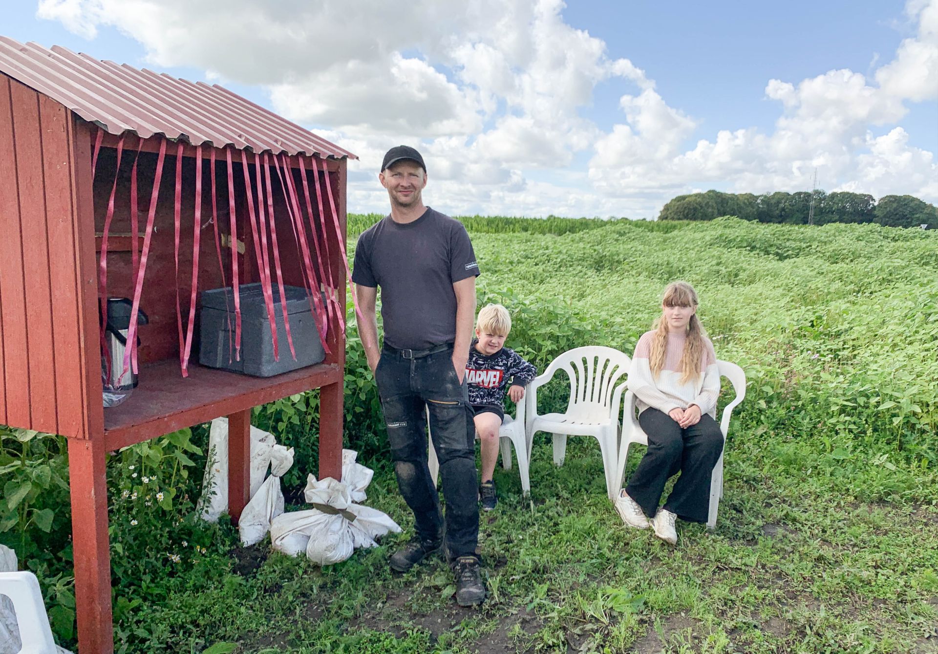 - Vi dyrker en del kartofler og jordbær i jorden, som vi går og passer. Og så har vi cirka en halv hektar jord med solsikker. Her var det så, vi fik en god ide. Vi har været på Samsø, hvor vi var inde i fem hektar skov, hvor der var lavet en stor labyrint, og den oplevelse har inspireret os til at lave vores helt egne solsikkelabyrint her i Sdr. Kollemorten, fortæller Kent, mens de to børn Lauge og Johanne gør klar til at vise pressens udsendte gennem labyrinten, mens storebror Marinus giver et nap med inde hos mor Birgitte, der i denne uge har lidt ekstra børn i dagplejen grundet ferie hos kollegerne.