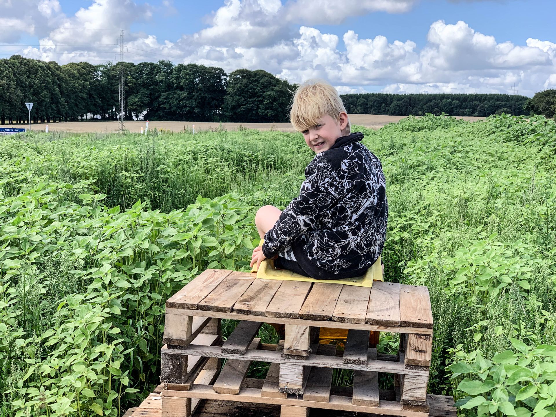 Grundet de usle vejrforhold med en lang tørkemåned uden regn, er solsikkerne ikke kommet helt op i gear endnu – de største solsikker er cirka på højde med Lauge, altså omkring 130 centimeter. Så medmindre man er under en meters penge, så skal man nok kunne finde sikkert rundt i labyrinten – og de mange blindgyder, som børnene har fået puttet ind i den.