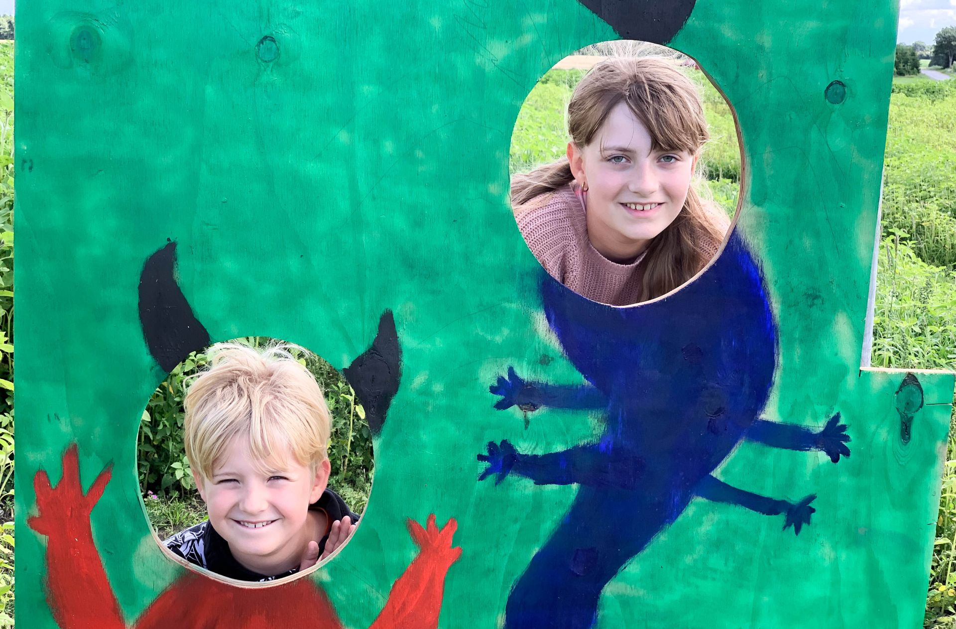 Kent har skåret nogle træfigurer ud af genbrugstræ, og dem har børnene så malet og lavet til monstre, der er placeret rundt omkring i labyrinten for at give lidt spænding til skattejagten.