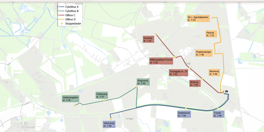 Foto: Her på kortet kan du se ruterne og de forskellige afgangstidspunkter på ruterne. Grafik: Firkløverskolen