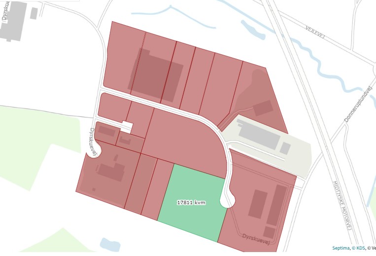 Der er tæt på udsolgt af erhvervsjord på Dyrskuevej. Grafik: Vejle Kommune