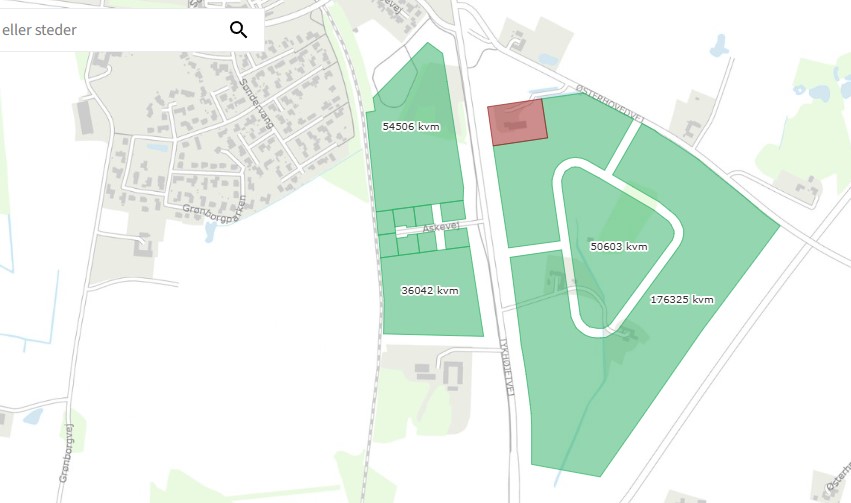 Her et kort over erhvervsjorden ved Tykhøjetvej og den nye udstykning på Askevej. Grafik: Vejle Kommune