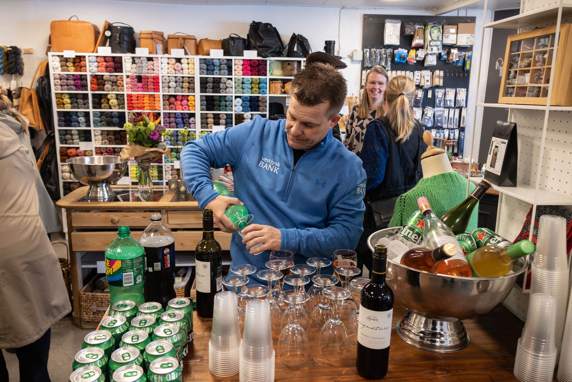 Receptionen var rammesat til at starte klokken 13.00, og folk myldrede lifligt ind ad døren både for at sige farvel til Jette efter 14 gode år i Give og for at hilse byens nye garnpige hjerteligt velkommen. Gavebordene blev hurtigt fyldt op, og Majas mand, Lars, der er filialdirektør i Vestjysk Bank i Give, havde rigeligt at se til som venlig udskænker i baren.