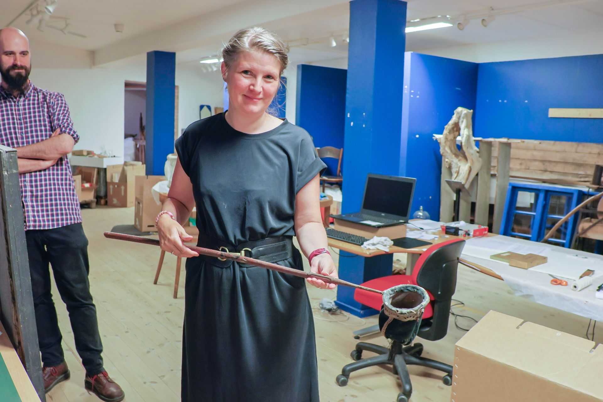 Celia viser her det 'apparat', man førhen brugt, når man samlede ind i forbindelse med gudstjenesterne. Ifølge myten var stangen forsynet med en spids genstand i enden, så man kunne prikke sovende kirkegængere op til dåd.Foto: Jim Hoff