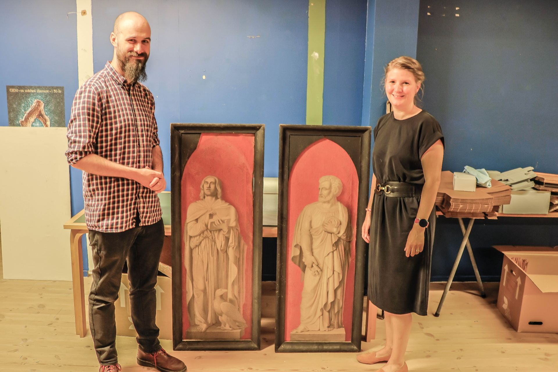 Rune Clark og Celia Ekelund Simonsen viser her de to sidestykker til altertavlen, som er skabt af kunstneren Lucie Ingemann. Foto: Jim Hoff