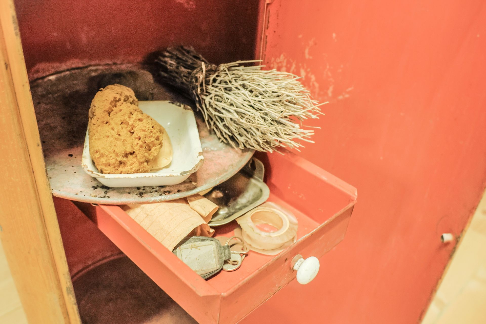 Servanten med vand, sæbe, barberkost osv. er en lille sjov ting. Det er slags transportabelt badeværelse, hvor præsten lige kunne nette sig mellem salmerne af Grundtvig og Ingemann, hvis håret eller skægget ikke sad helt efter de præstelige foreskrifter.