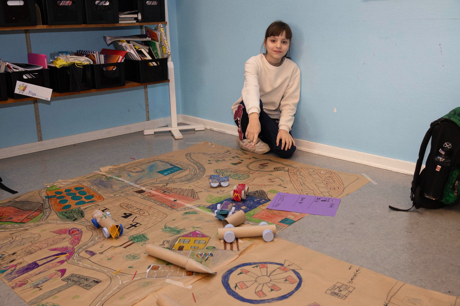 -Eleverne er blandet rent aldersmæssigt på tværs af klaserne. Det er jo også et af formålene med sådan en emneuge med venskab som tema, at eleverne kommer til at kende hinanden lidt bedre, både de store og små på kryds og tværs. Det hygger de sig med.