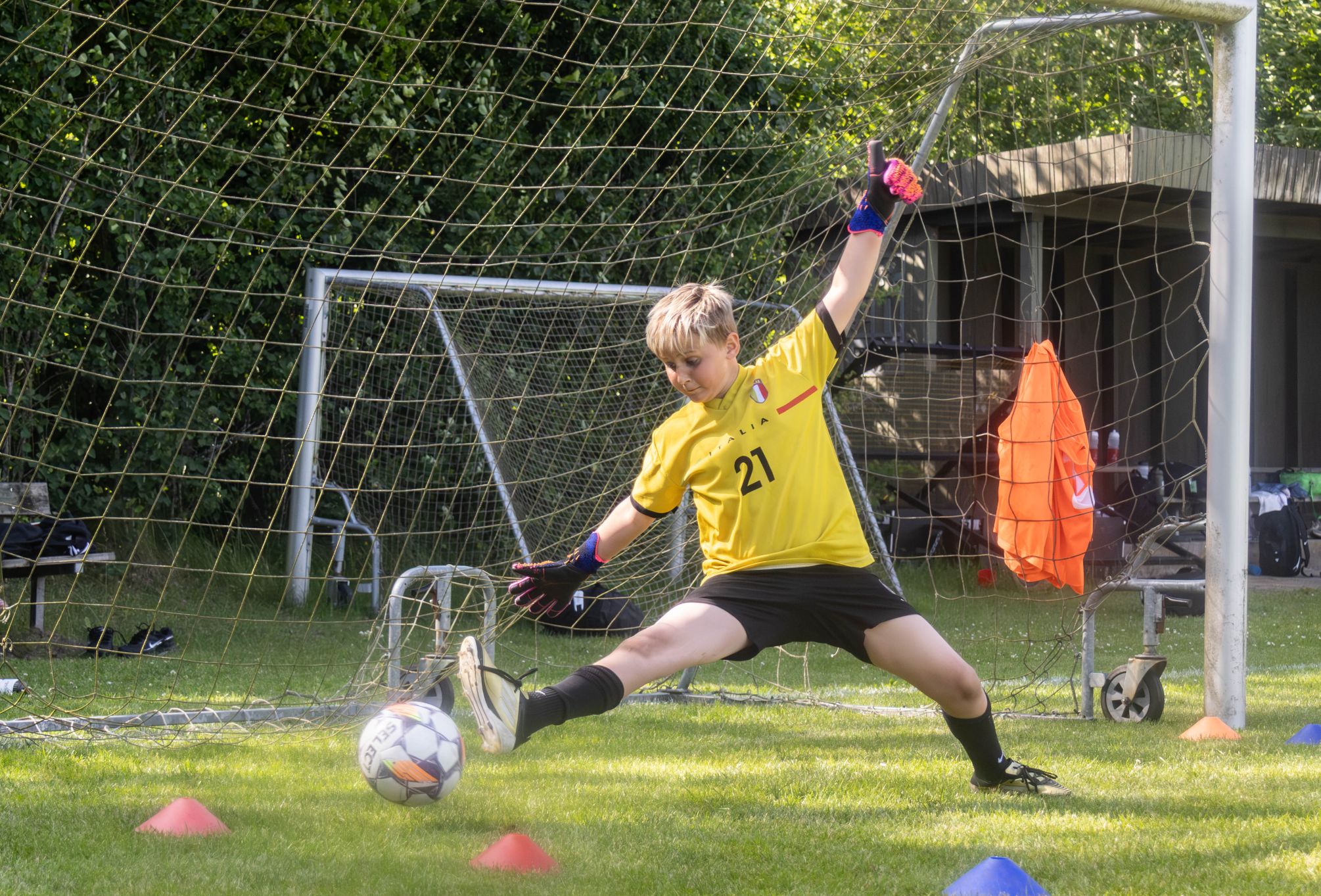 Målmændene er også i den grad i ilden, når markspillerne har skudtræning. Her en klasseredning med det yderste af tåspidserne. Foto: Jim Hoff