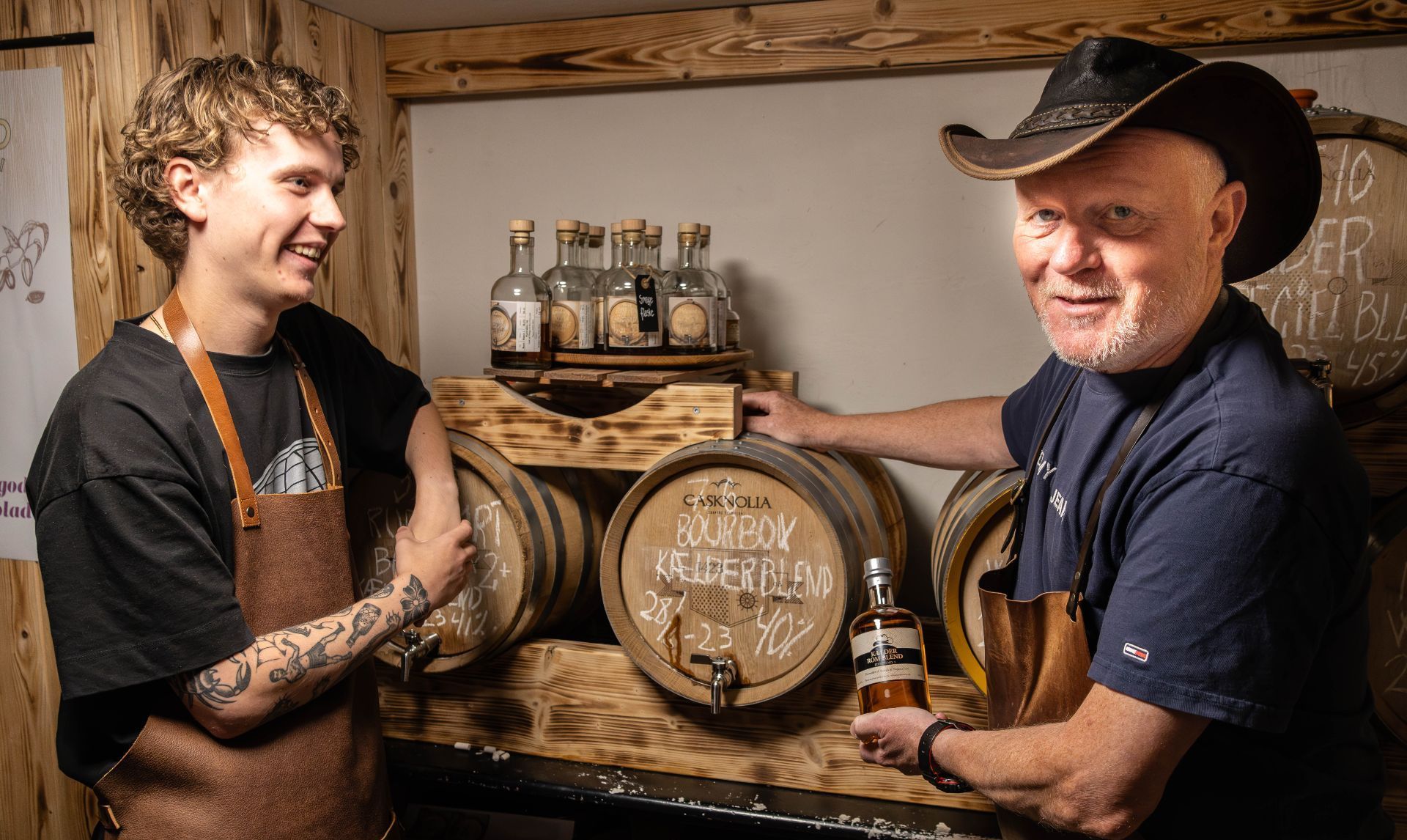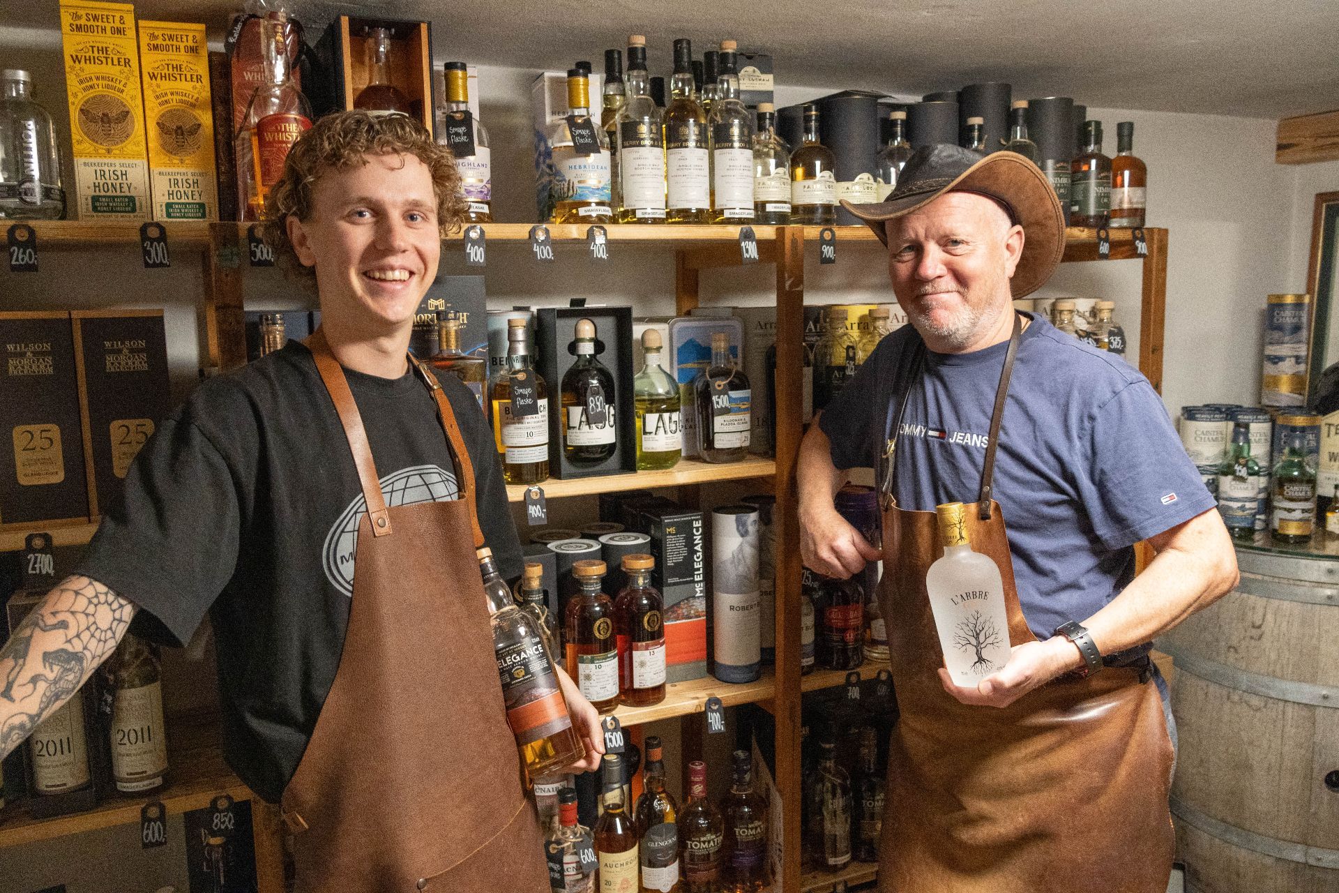 Der vil være masser af spændende smagsprøver på programmet når Johnny Mortensen, her med sin søn Malthe, der er startet i butikken, inviterer til Spiritus og Portvinsfestival. Foto: Jim Hoff