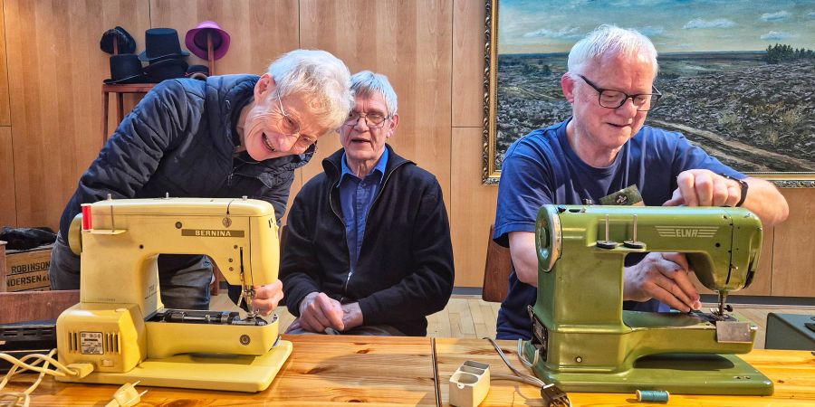 Foto: Ved denne måneds Repair Café på Museum Give dukkede en kvinde op med to defekte symaskiner, og dem kastede de friske handymen sig over med stor lyst og gejst. Den ene af maskinerne kom da også op at køre igen. Foto: Museum Give