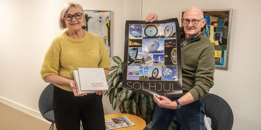 Foto: Jørgen Lundsgaard og Mette Hindhede fra Skulpturby Give viser hen den fine historiske bog, Kunst i Øjenhøjde' og den fine plakat med Solhjulet, man kan købe forskellige steder. Foto:Jim Hoff