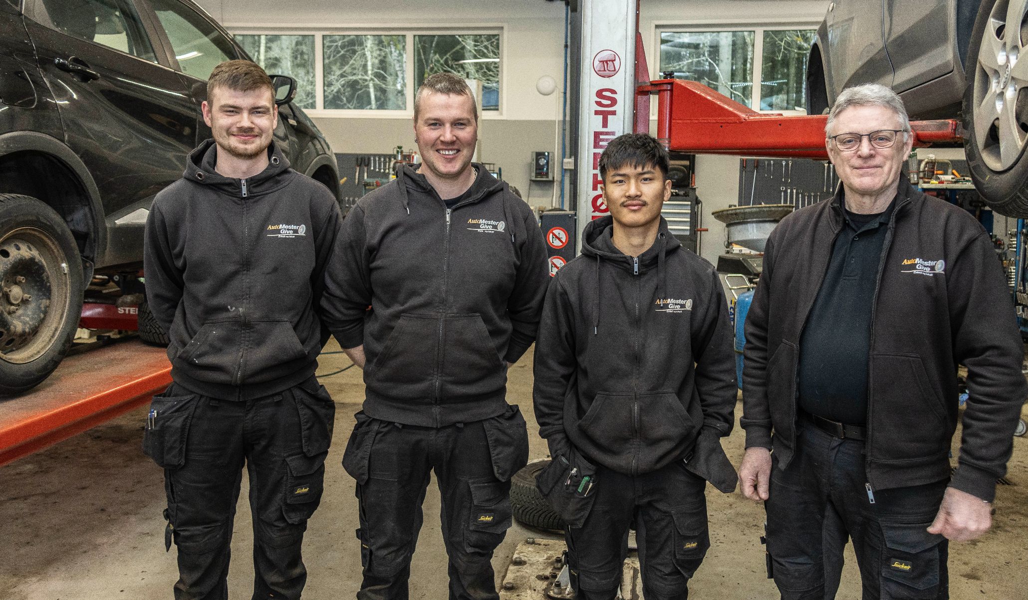 Team Automester Give består af fra venstre Christian, Kenny, Chuck og mester ham selv, Karl Peter. Foto: Jim Hoff