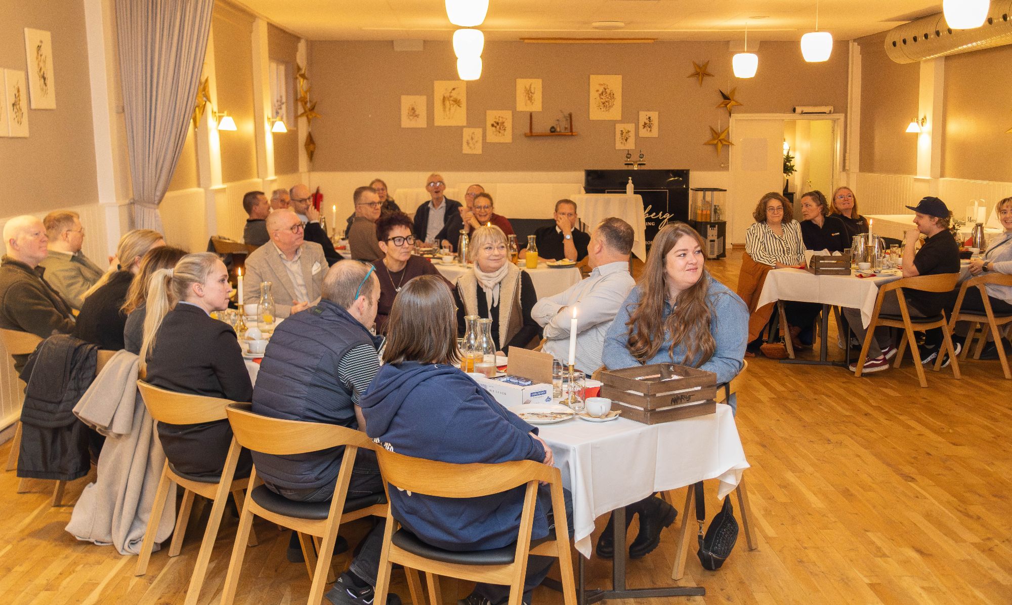 Igen i år blev det hyggelige morgenmøde afholdt på Diagonalkroen, hvor kromanden Lasse og hans team havde dækket og pyntet rigtig flot op ved de hyggelige morgenborde. Der mødte 33 butiksfolk op til seancen, hvor Give Handel & Erhvervs formand, Hanne Lund, efter kaffe og rundstykker holdt en tale om årets gang i 2025 i handelsstandsforeningen.